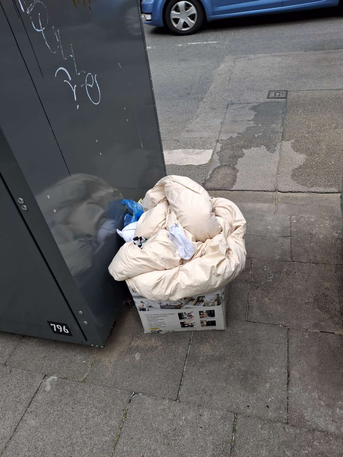 Gegenüber der Blücherstr. 15 wurde eine Kiste mit sltem Bettzeug abgestellt.