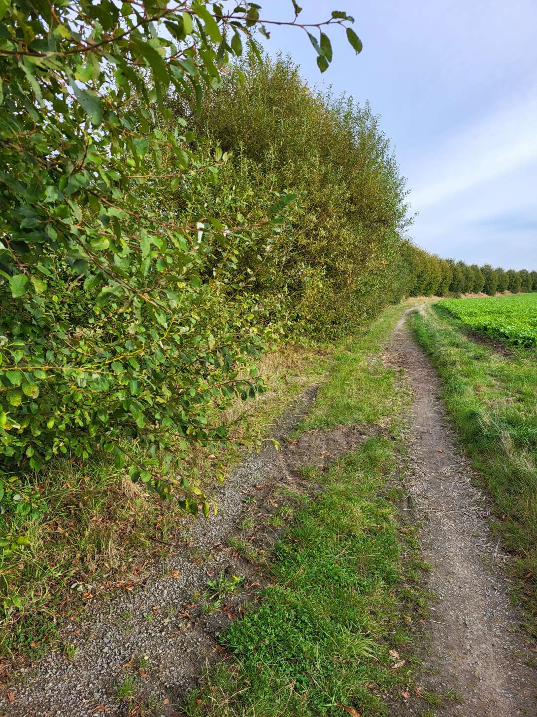 Brombeerhecken mit Dornen und Büsche wachsen auf den Feldweg entlang dem Lise-Meitner-Ring (unterer Weg am Feld), so dass er kaum noch als Spazierweg genutzt werden kann.