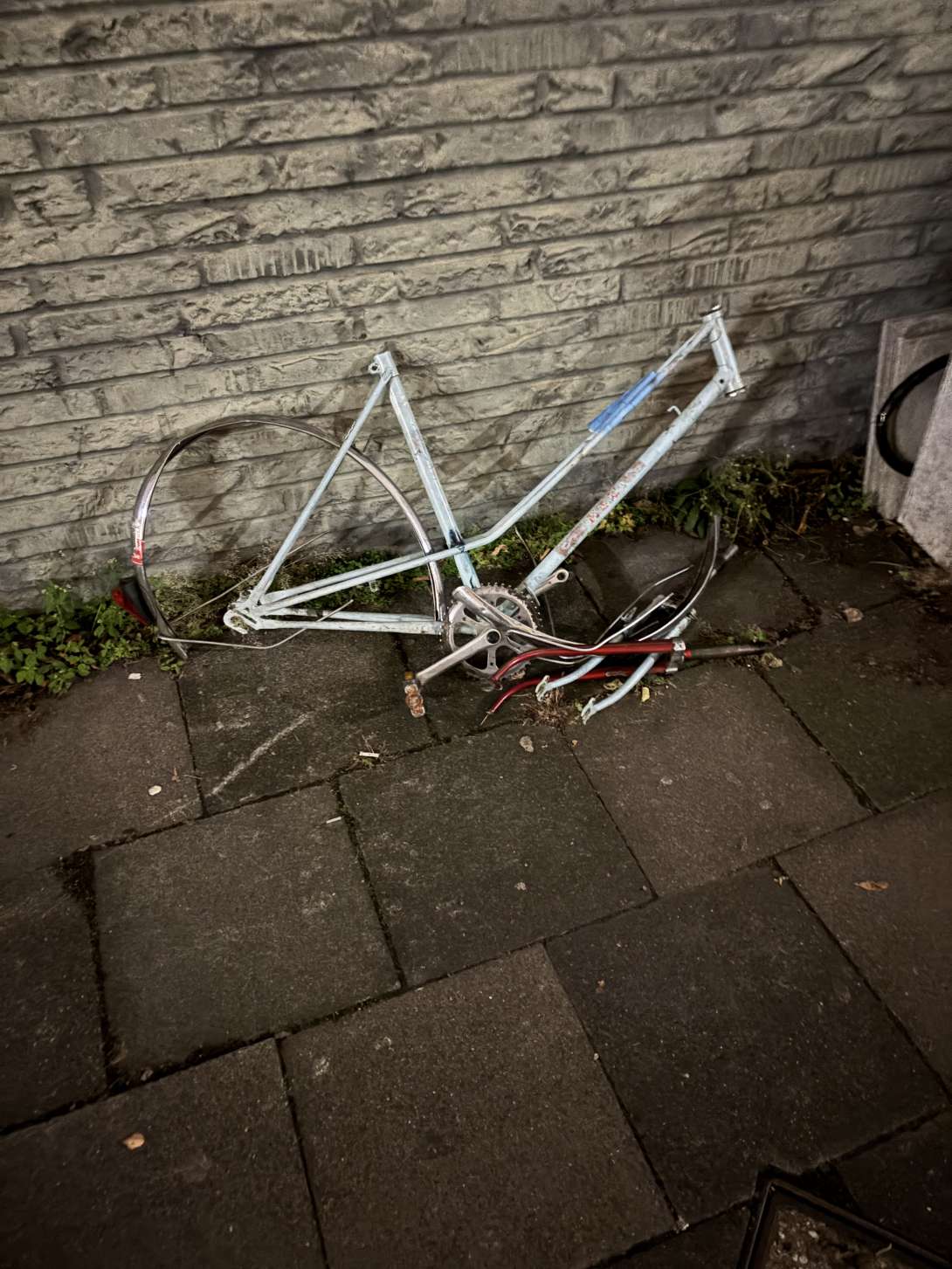 Fahrrad liegt in Einzelteilen auf der Straße.