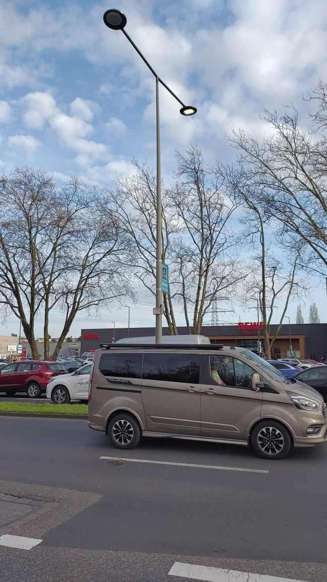 Die Lampe in FR Dellbrück der Doppelleuchte auf dem Mittelstreifen vor dem REWE-Parkplatz leuchtet Tag und Nacht.