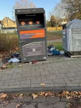 Spielplatz gleicht einer Mülldeponie. Tonnen schon länger nicht geleert.