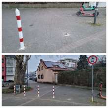 Pesch: Absperrpfosten SEHR alt und abgenutzt. Signalfarben kaum noch sichtbar. Außerdem wiederholt lose und schief.