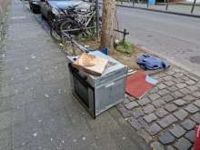 Kaputter Backofen sowie anderer Müll liegt auf Bürgersteig und ragt in Parktasche rein.