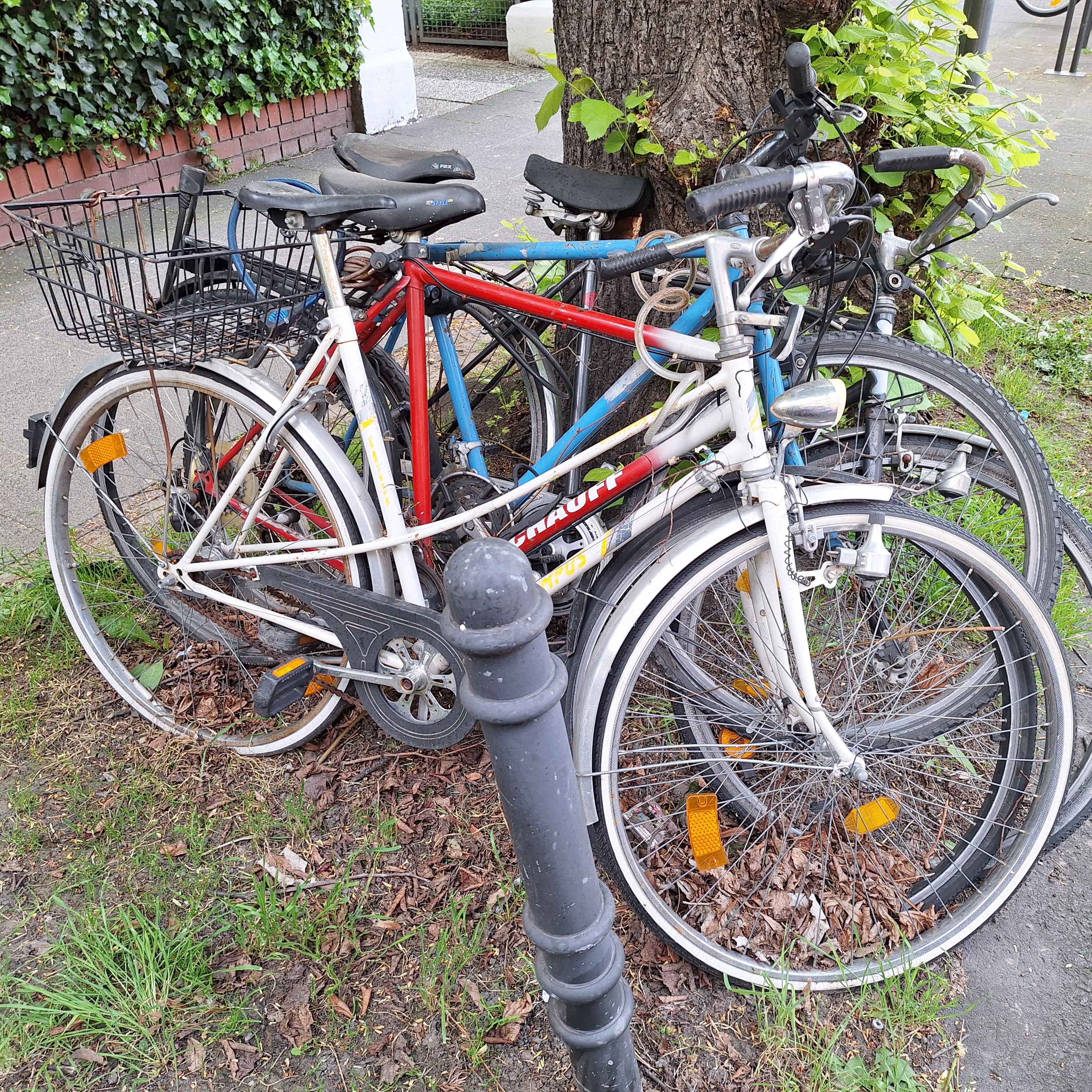 Hier stehen am Baum gelehnt zwischen Hausnr. 6 und 8 vier Schrotträder.