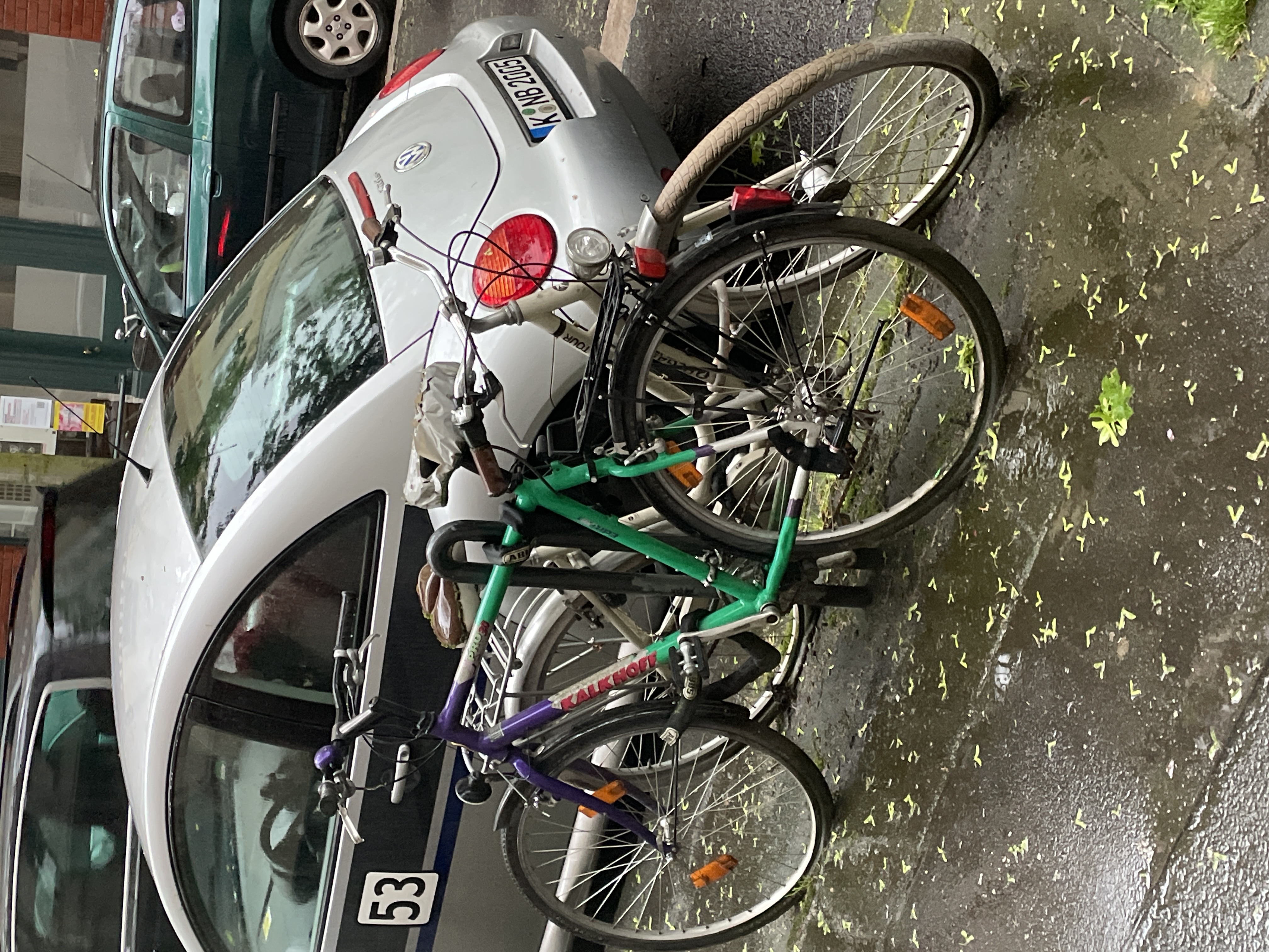 Es stehen hier zwei sehr verwahrloste Fahrräder mit platten Reifen und mit Moss bewachsenen Sätteln. Sie sind beide an dem selben „Fahrradpoller“ angeschlossen und stehen dort schon unverändert mindestens ein Jahr lang. Das eine ist grün/ Lila und es steht in pink Kalkhoff drauf. Das andere ist beige und es steht pegasus in schwarz drauf.