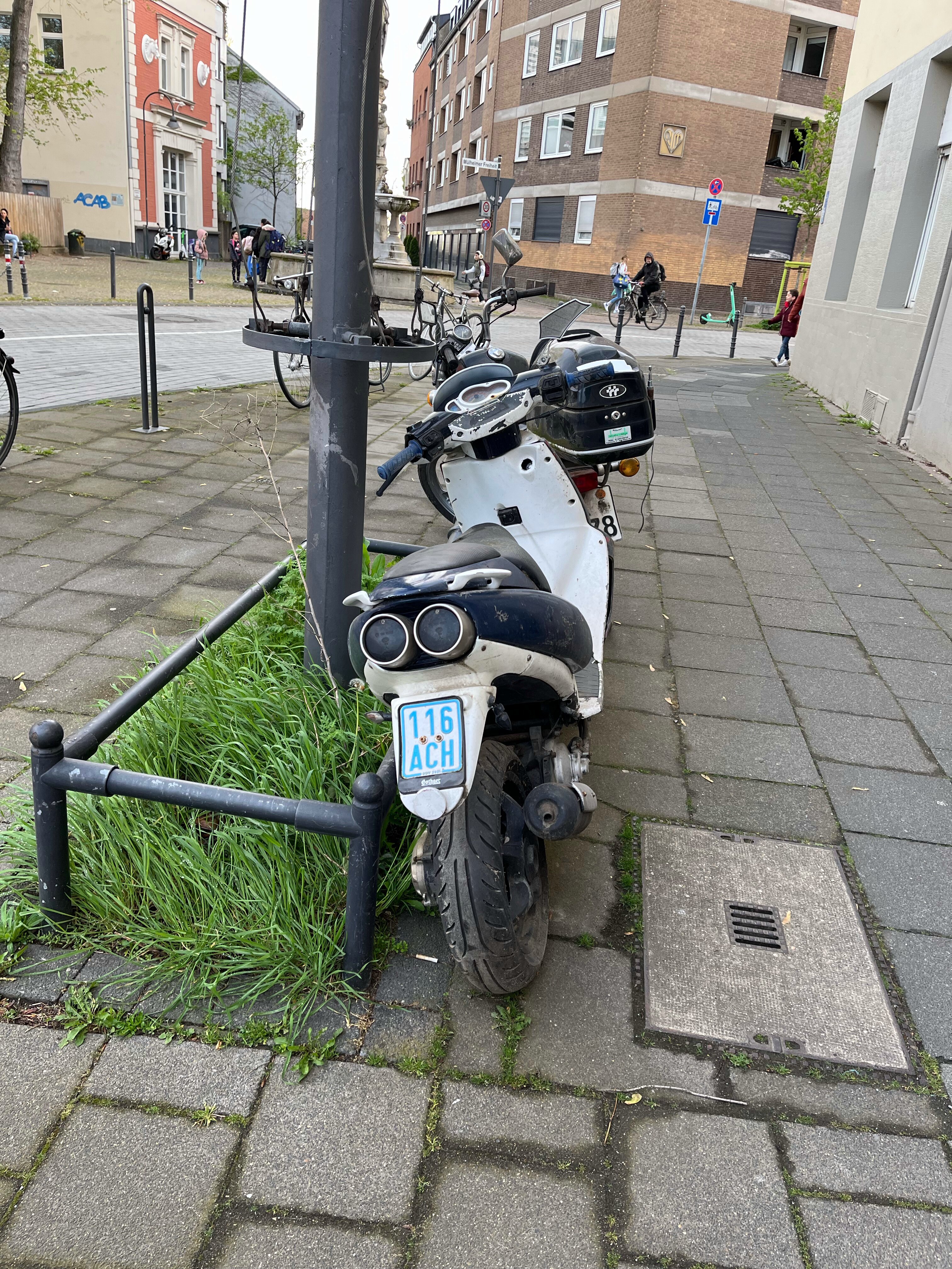 Auf dem Gehweg gegenüber der Grundschule sind zwei "Schrottfahrzeuge" seit längerem abgestellt. Ein Roller ohne Zulassung und ohne Versicherungsschutz.