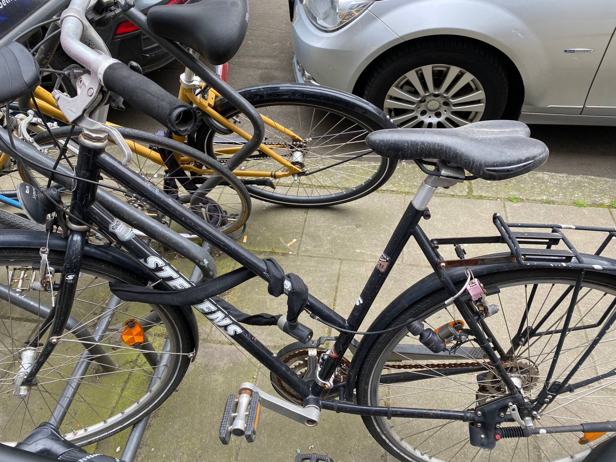 Am Fahrradständer vor der Richard-Wagner-Str. 14, 50674 Köln, steht schon seit Monaten unbewegt ein schwarzes Stevens-Fahrrad mit Platten und blockiert den Stellplatz.