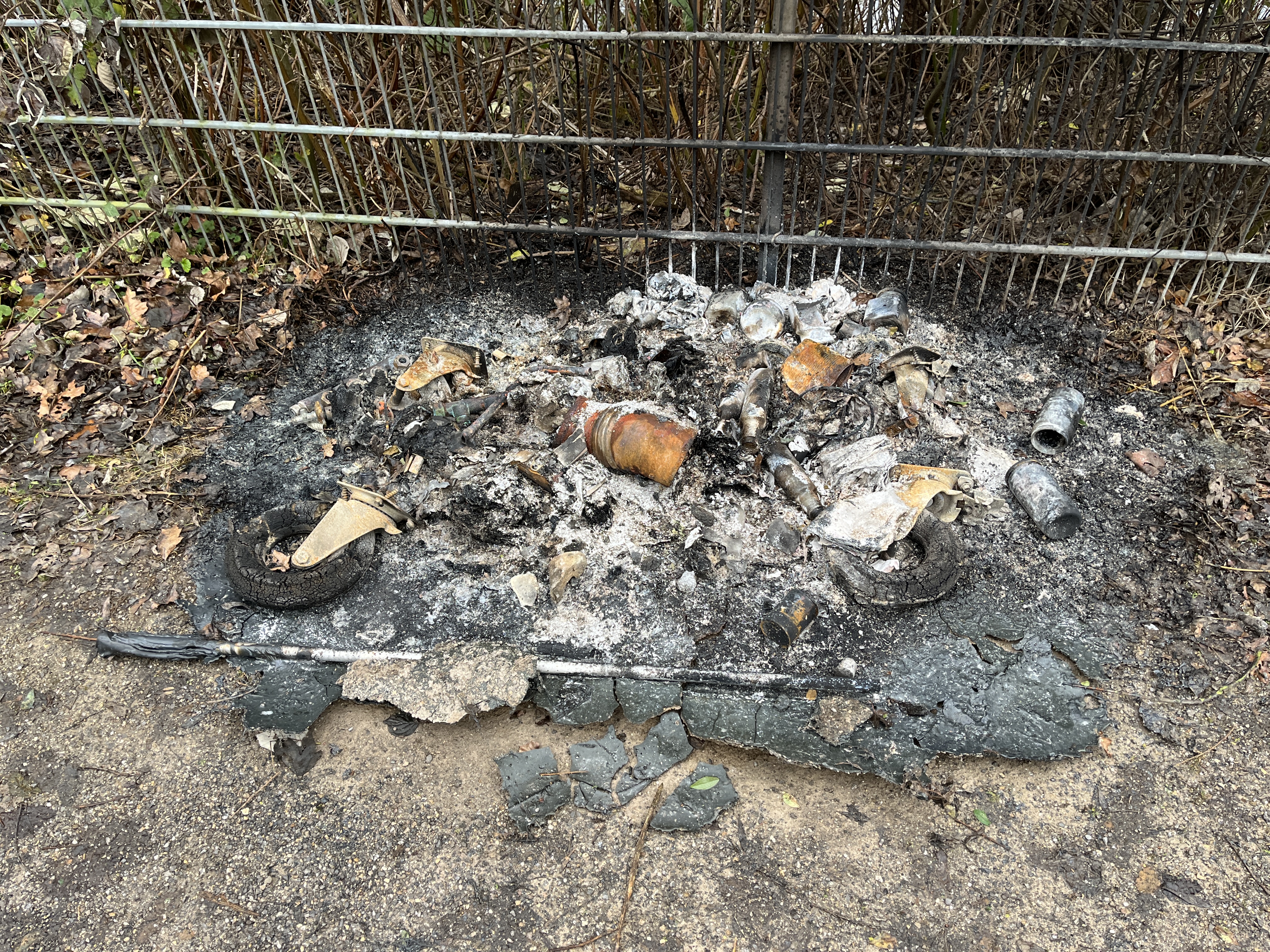 Ausgebranntes Rad/ Roller am Vogelschutzzaun Fühlinger See