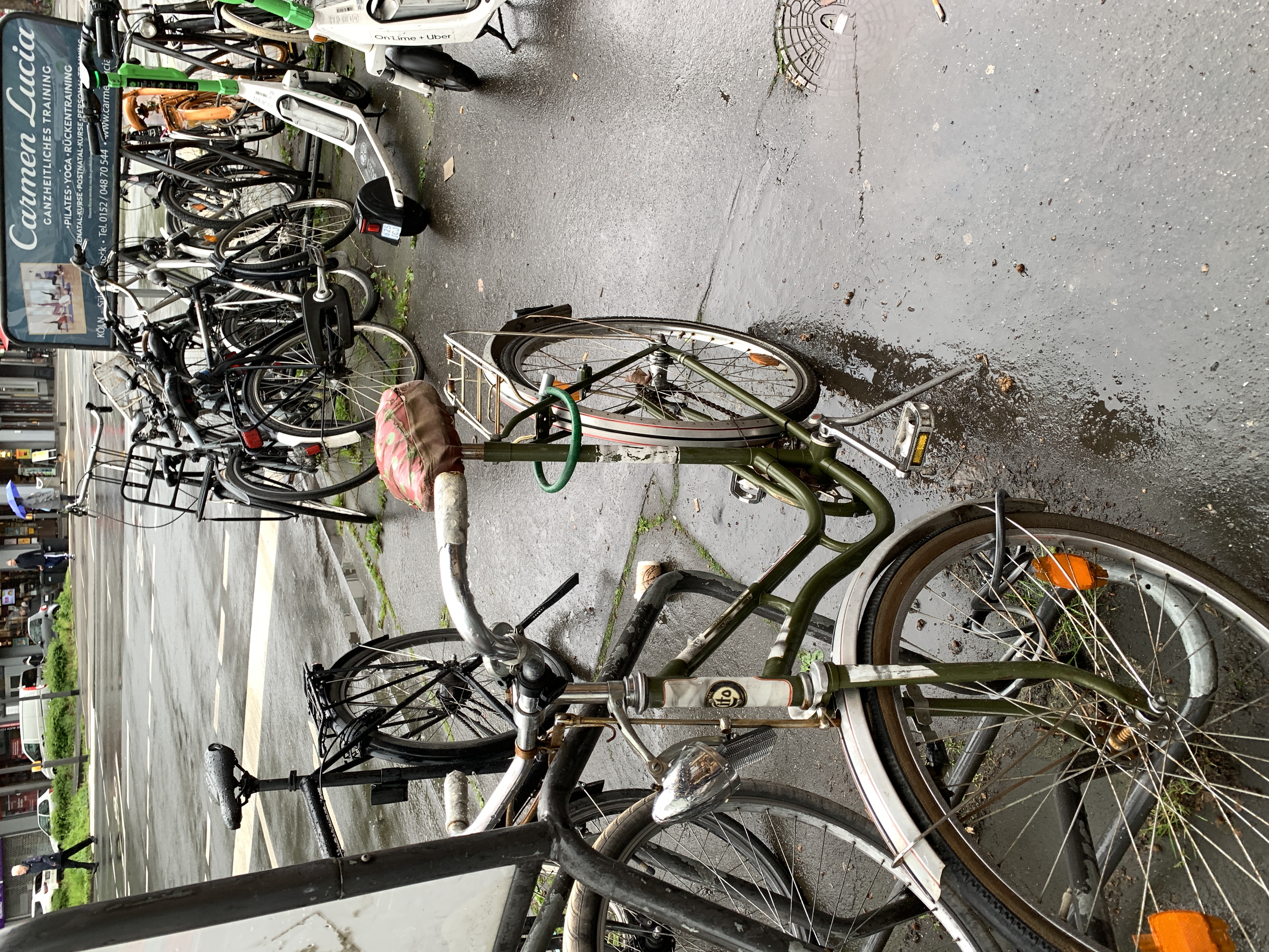 Mehrere Schrotträder vor der Bäckerei Merzenich