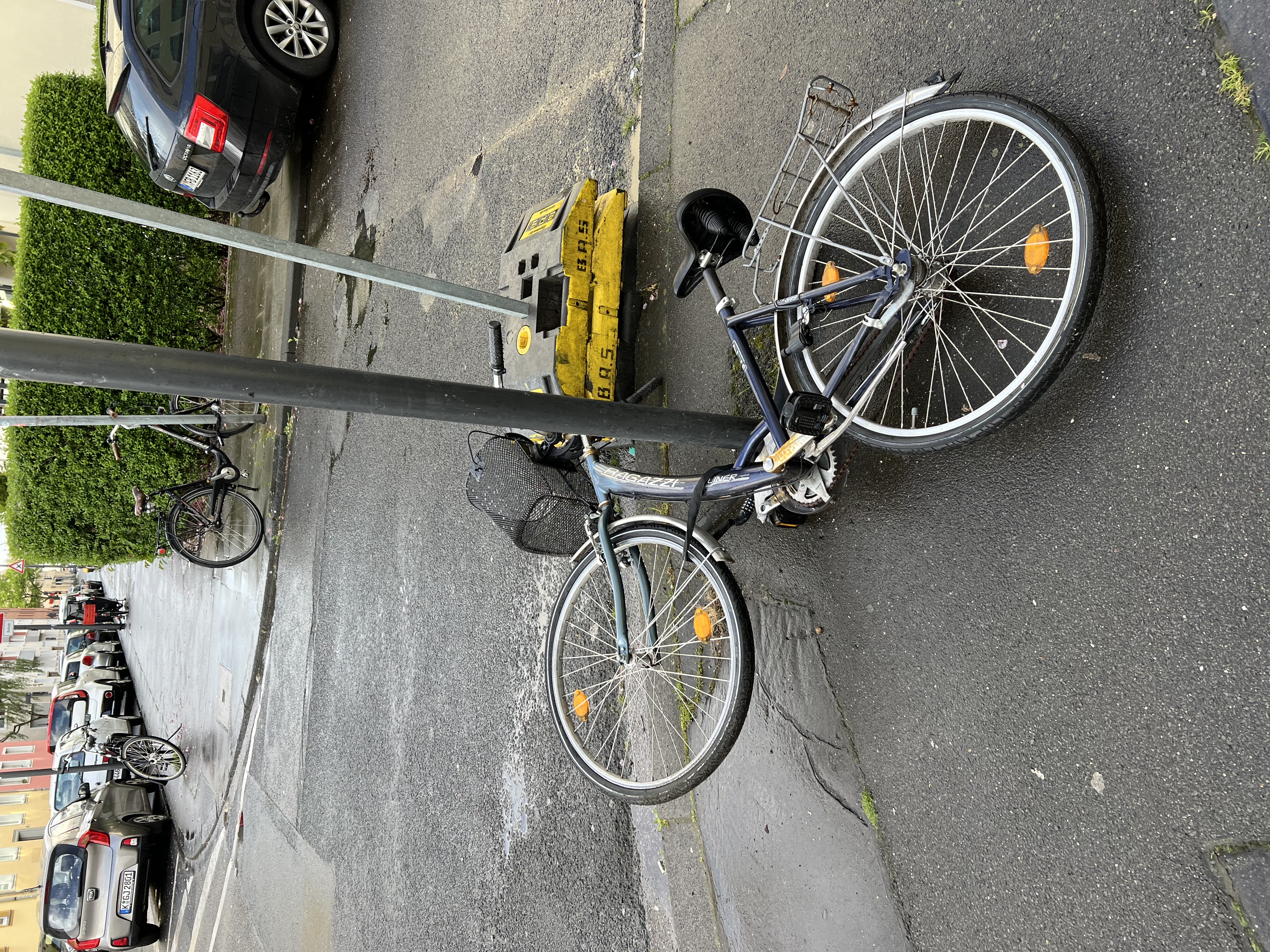 Angeschlossen an Straßenschild, Schutzblech verbogen, wenig Luft auf den Reifen.