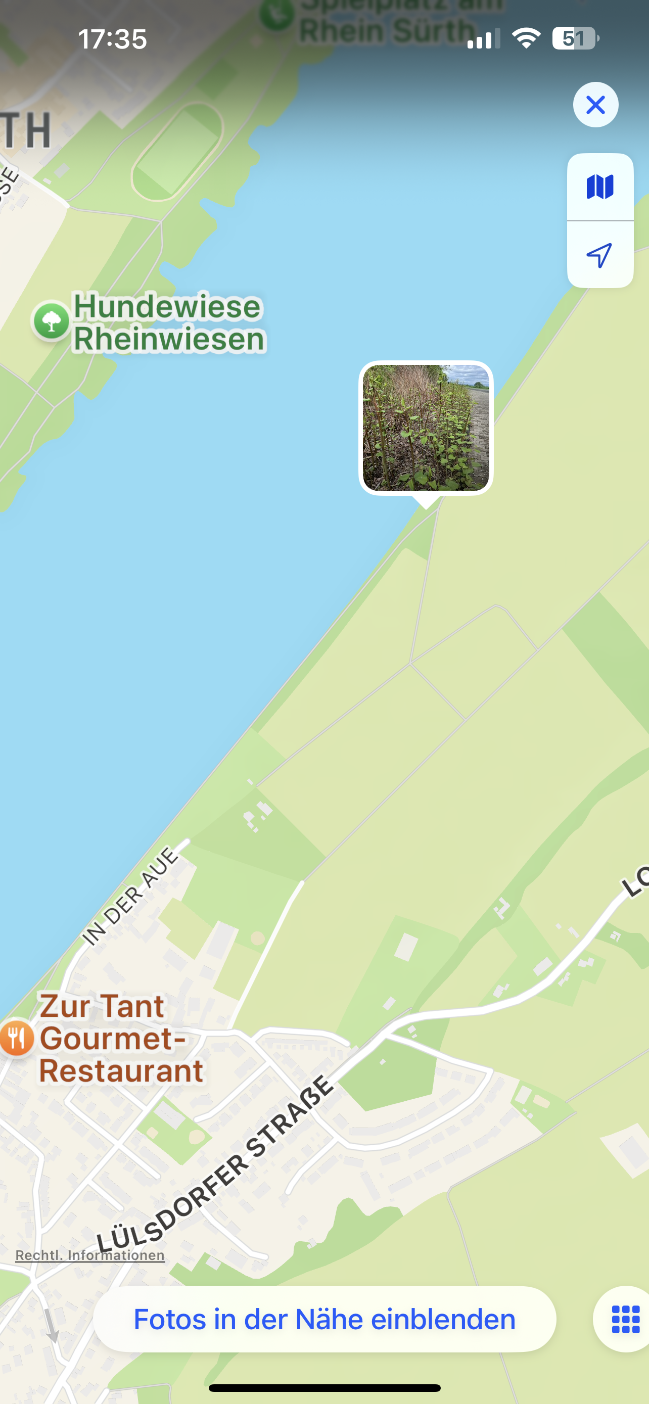 Wenn man am Restaurant zur Tant in Porz-Langel unten auf dem Weg am Rhein in Richtung Zündorf geht und kurz bevor der Weg wieder auf den Damm mündet, wächst auf einigen Metern japanischer Knöterich. Dies ist eine invasive Pflanze, die heimische Pflanzen verdrängt.