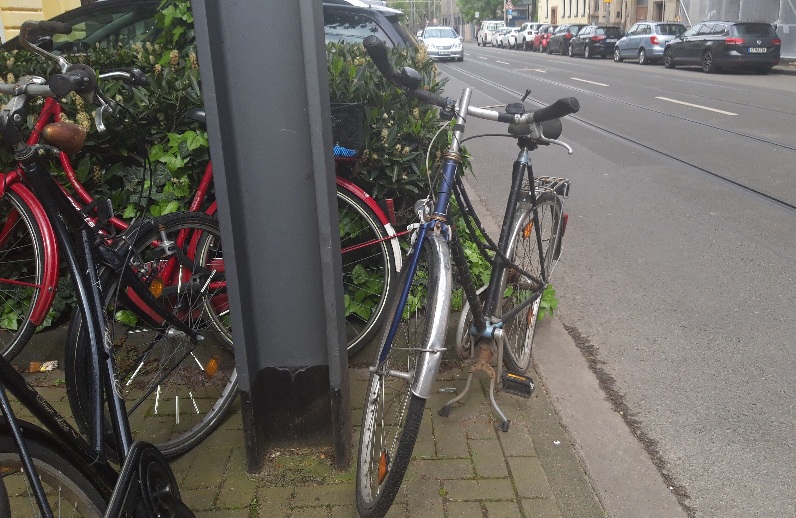 Eifeste 22 ein Damenrad blau/sw seit längerer Zeit abgestellt und völlig demoliert. Stellt eine Unfallgefahr dar, weil in Fahrbahn teilweise gestellt.