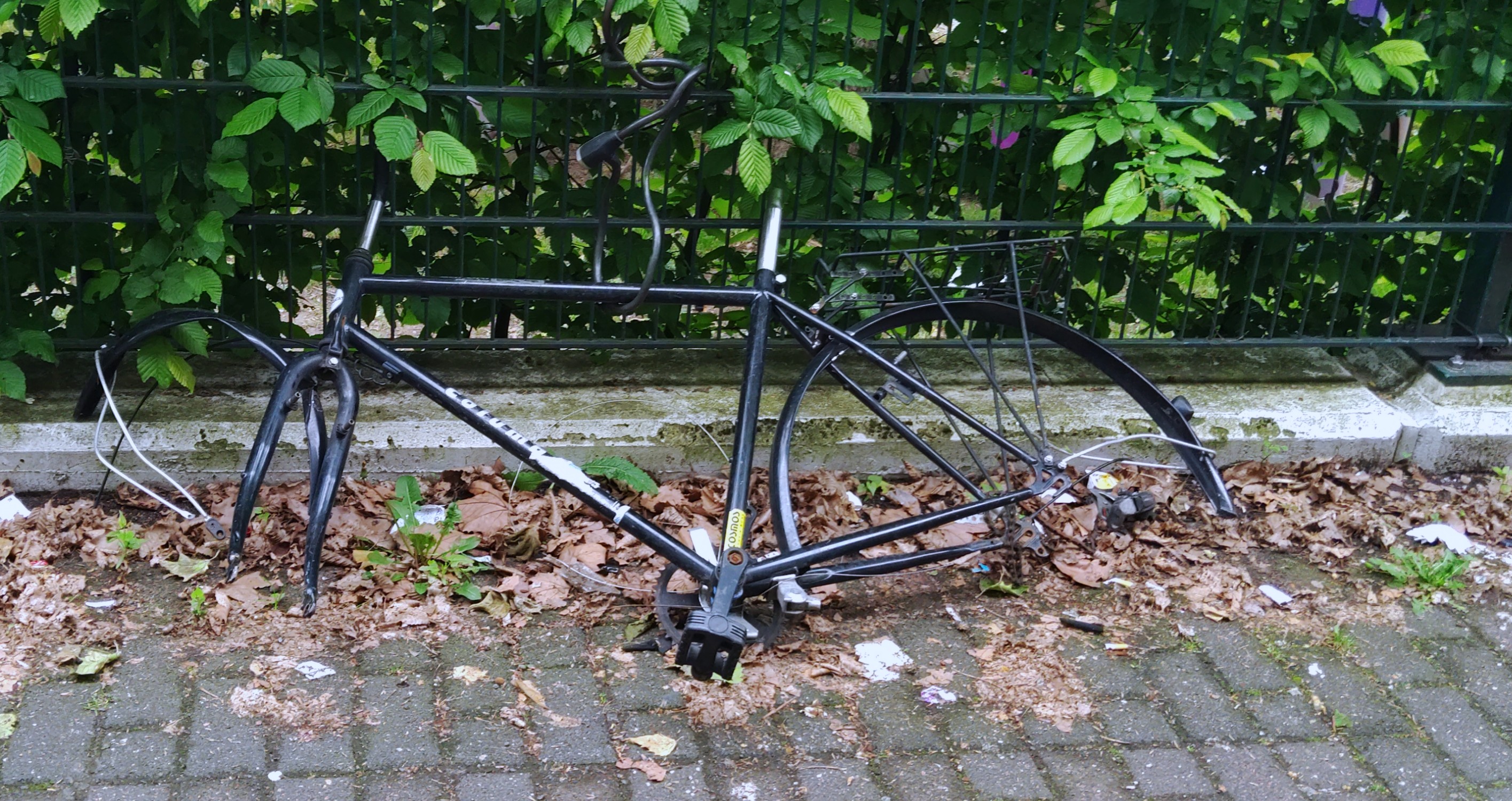 Entgegen der Abschlussmeldung #11348-2024 vom 02.05.2024 befindet sich das Schrottrad nach wie vor am gemeldeten Ort (Zuweg zum Bf Köln-Trimbornstr. aus Richtung Walter-Pauli-Ring).