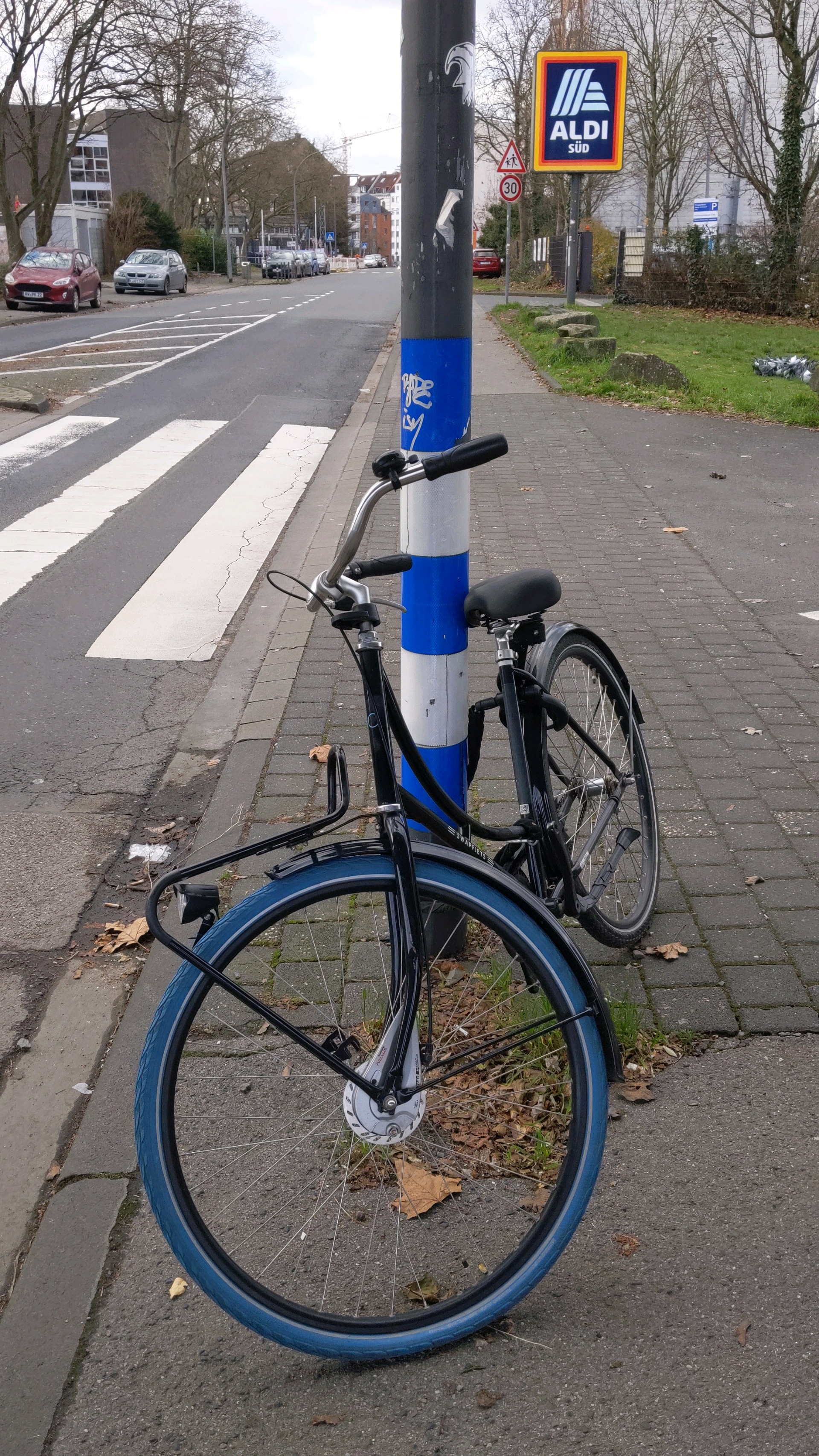 Am Zebrastreifen am Niehler Kirchweg, ca. in Höhe des Aldi-Supermarktes, steht seit einigen Wochen ein Schrottfahrrad.