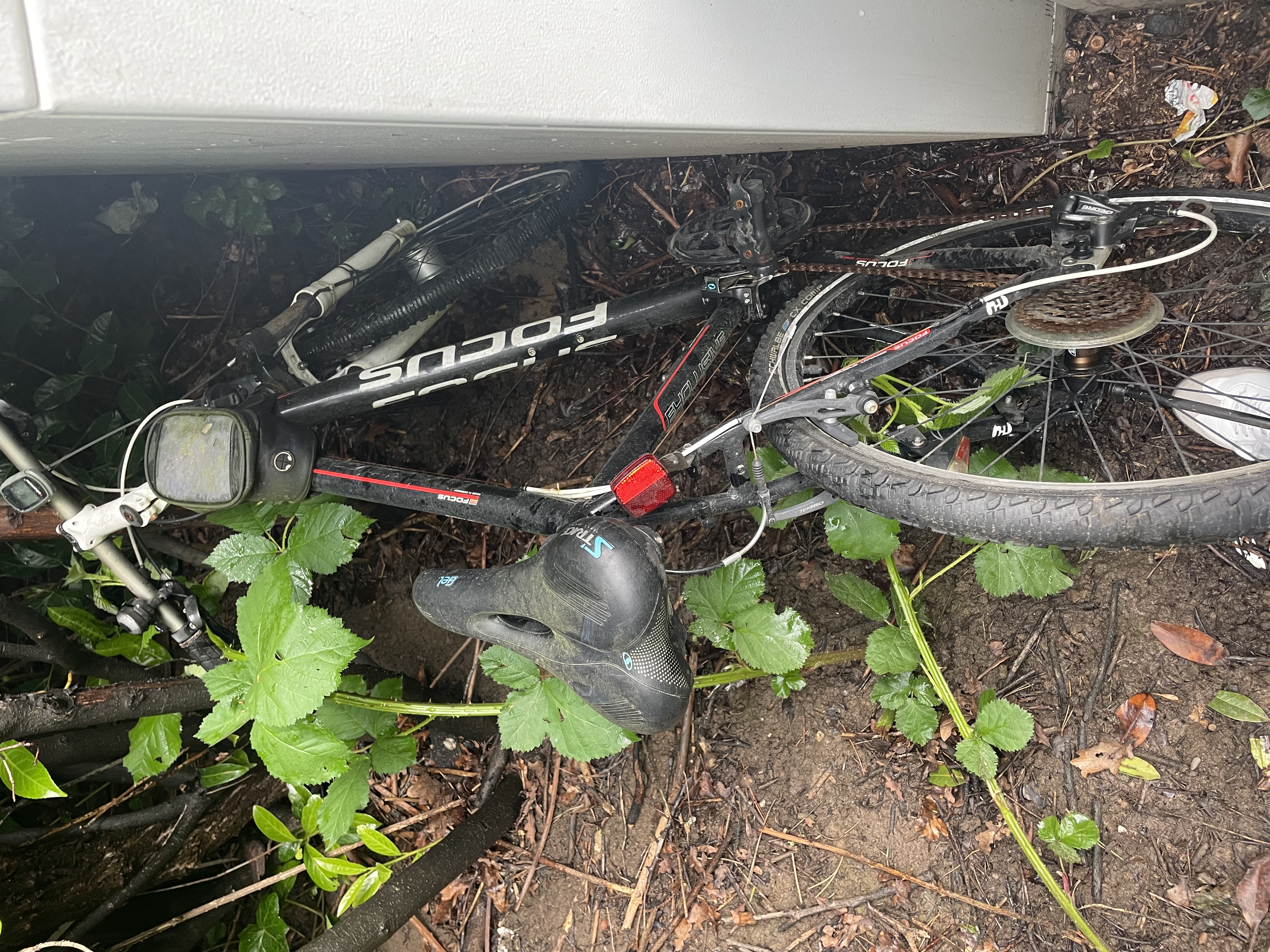 Hinter dem Fernmeldekasten, hinter dem Grundstück Balsaminenweg 12, gegenüber Eingang Balsaminenweg 16, steht ein defektes Mountainbike, unabgeschlossen!
