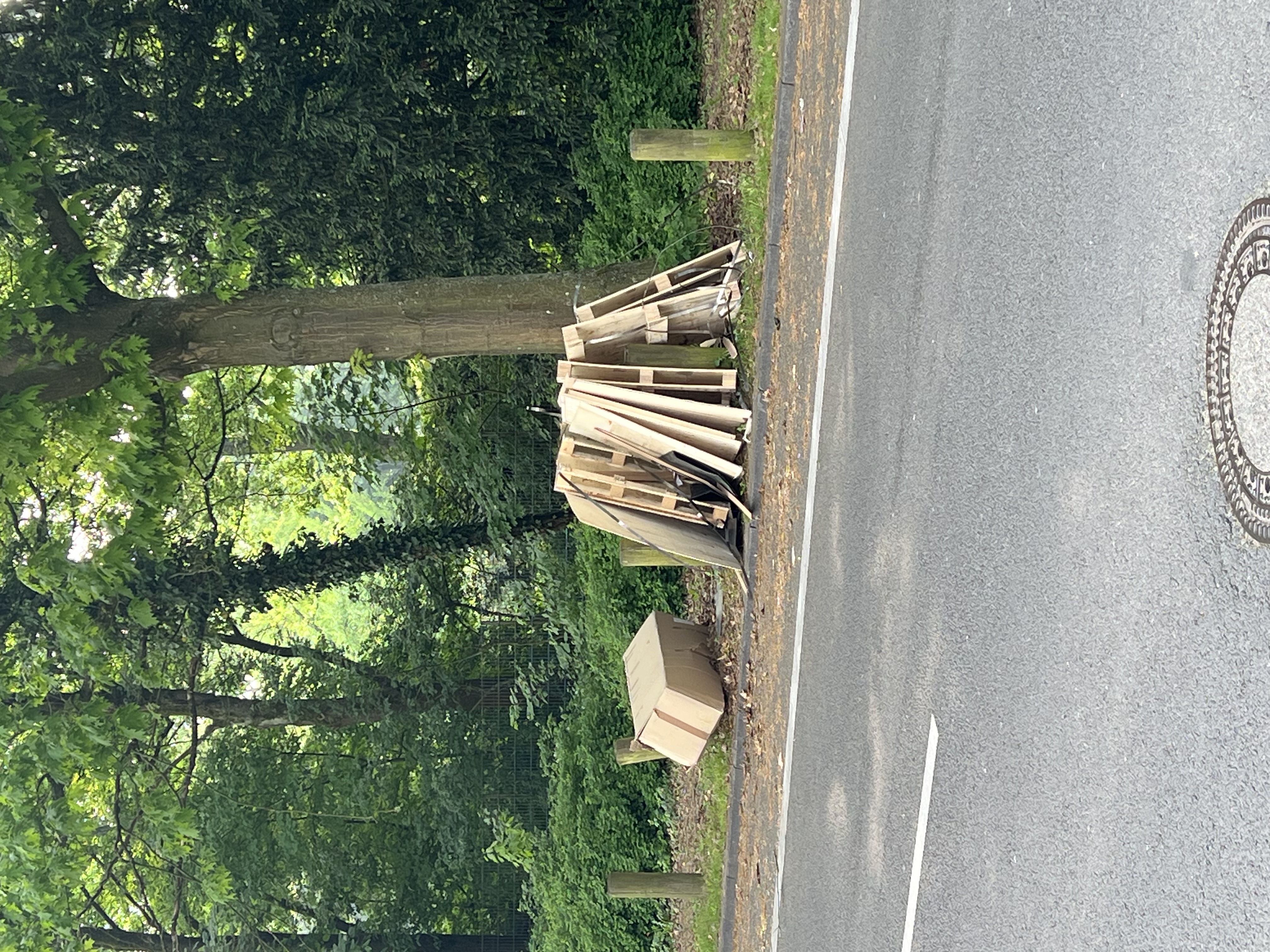 Mehrere Paletten und Verpackungsmaterial. Ein paar Meter vorher am / im Mülleimer ähnliches Zeug (siehe vorherige Meldung)