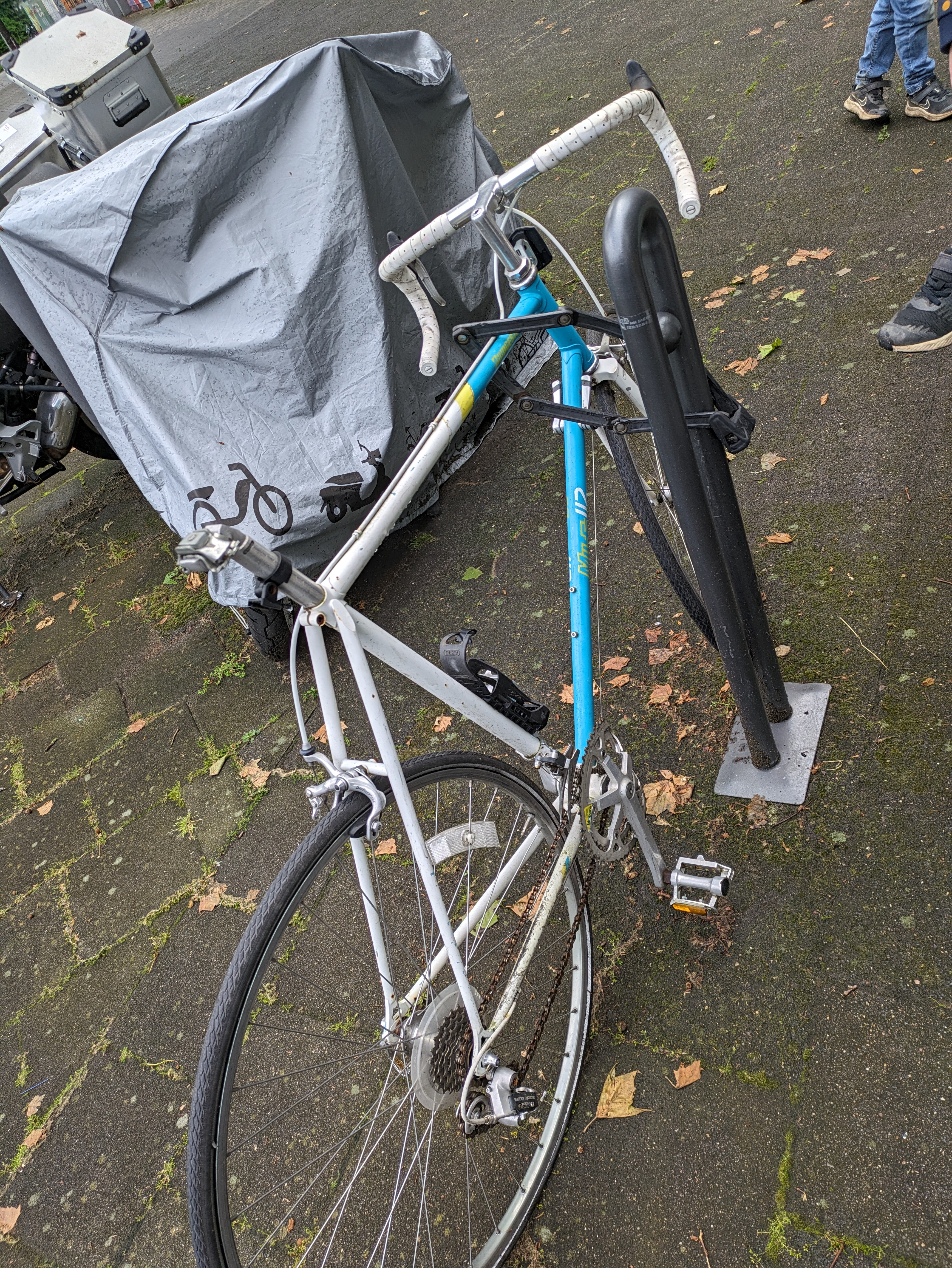 Nicht mehr fahrtüchtiges Rad blockiert seit längerer Zeit einen Fahrradständer.