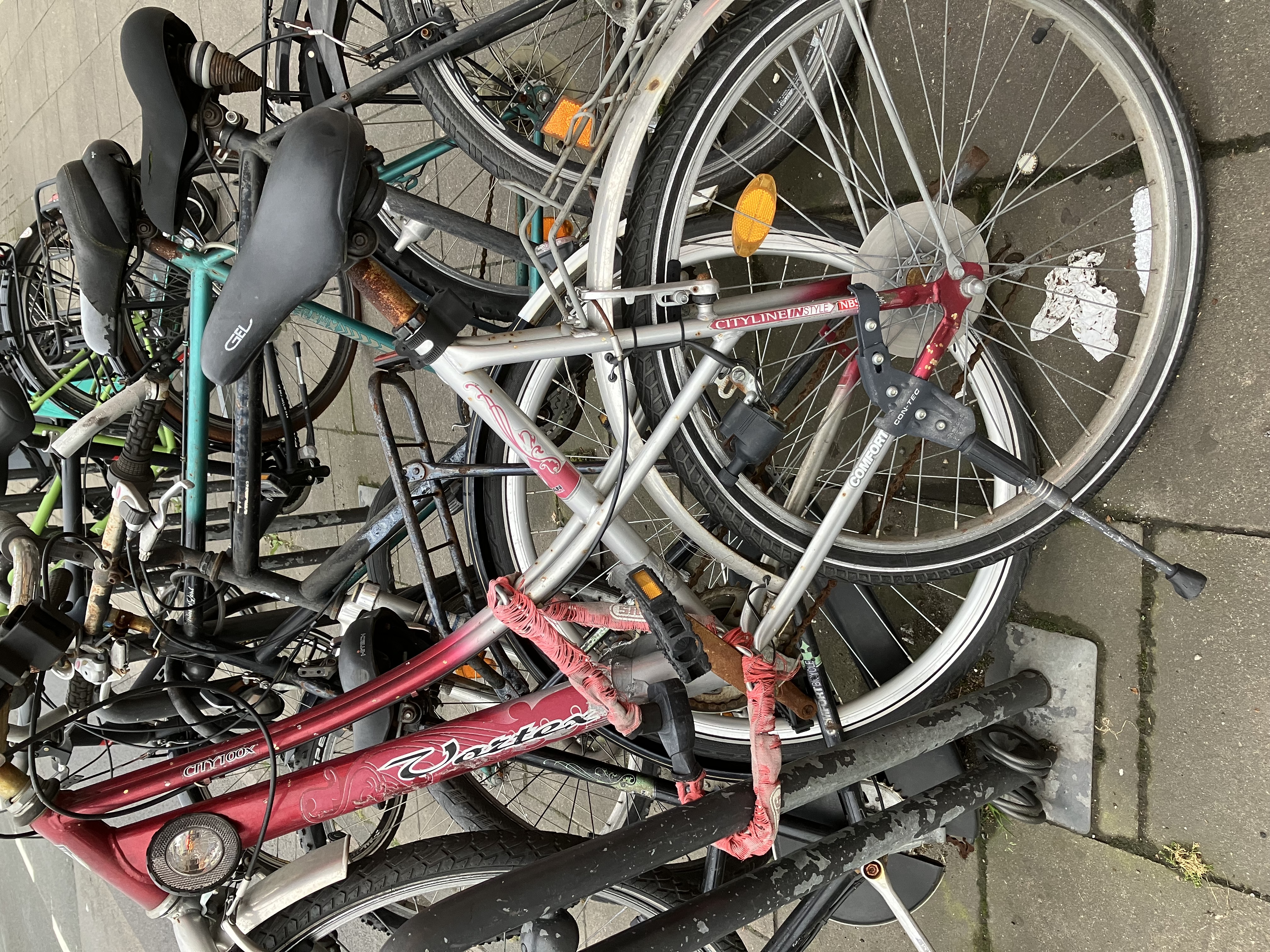 Guten Tag, vor der Bäckerei Kraus auf der Aachener Straße/Melatengürtel sind vier SchrottFahrräder angeschlossen an einem Fahrradbügel.
