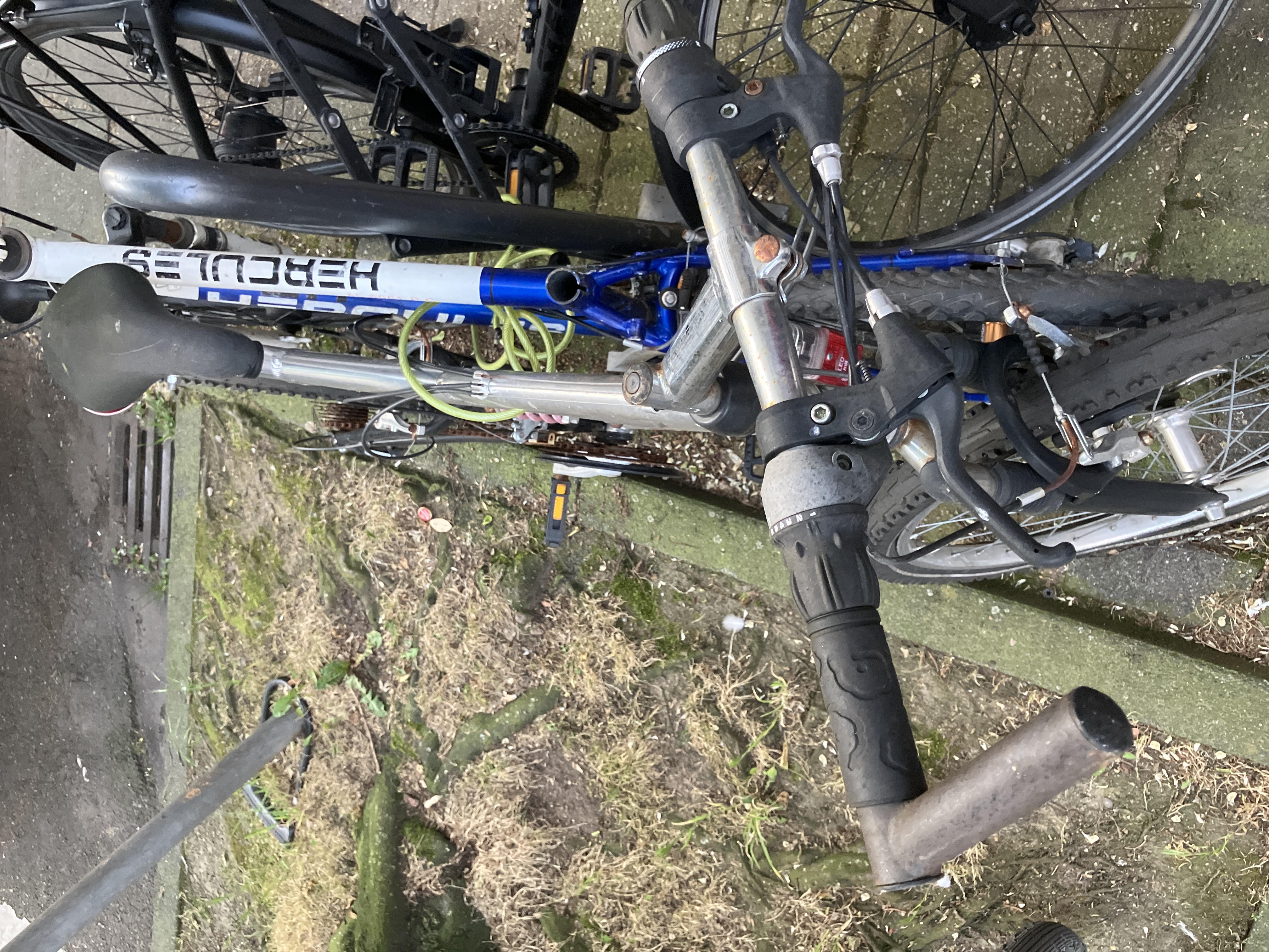 Zwei Schrottfahrräder mit komplett verrosteten Ketten, platten Reifen und teils vermoosten Reifen.