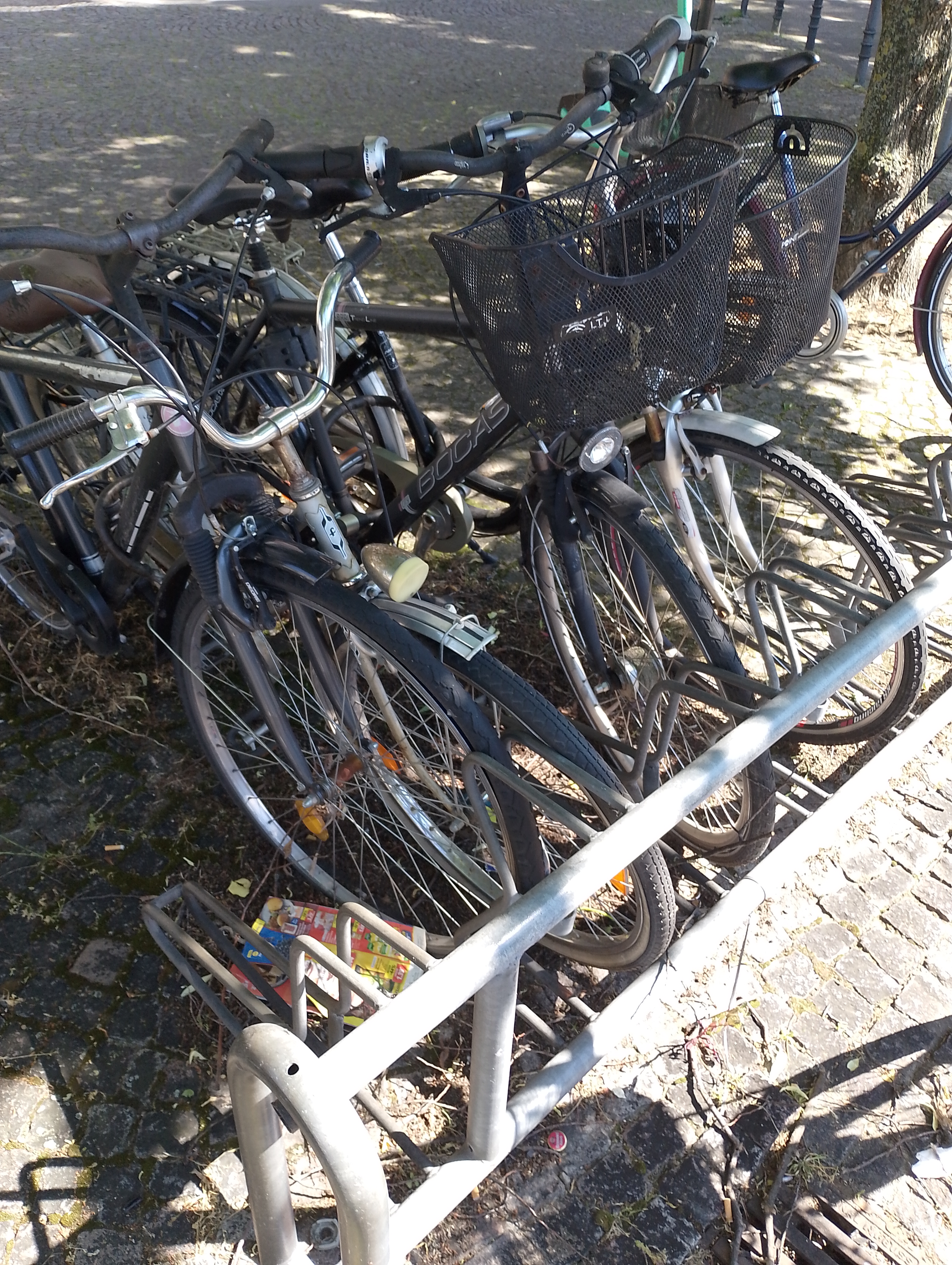 Vor der Drogerie DM blockieren den rechten äusseren Fahrradständer 4 verlassene Fahrräder