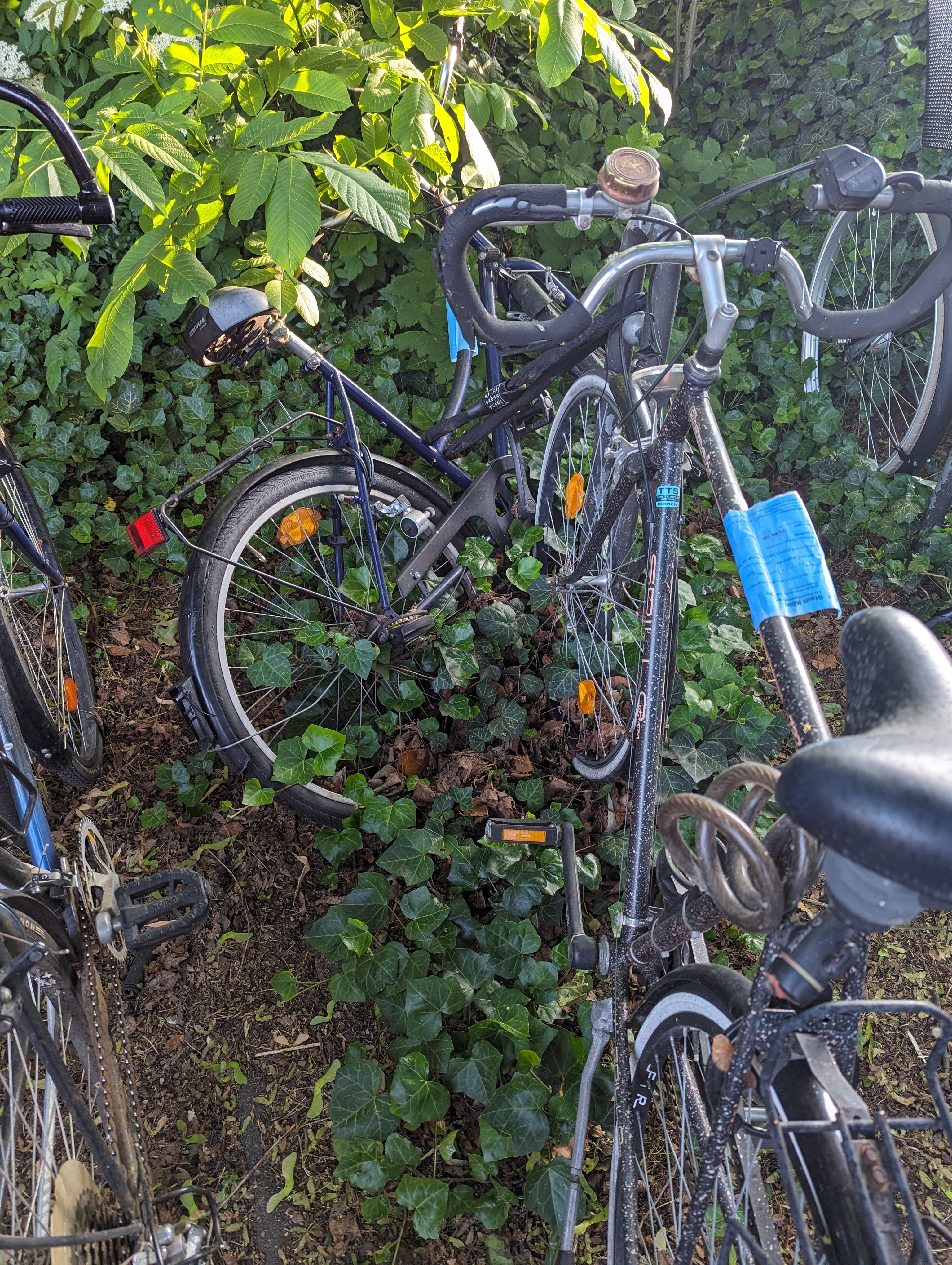 2 völlig schrottreife Fahrräder. Bereits mehrmals von der Stadt markiert. Zuletzt im April 2024 mit einem blauen Zettel .