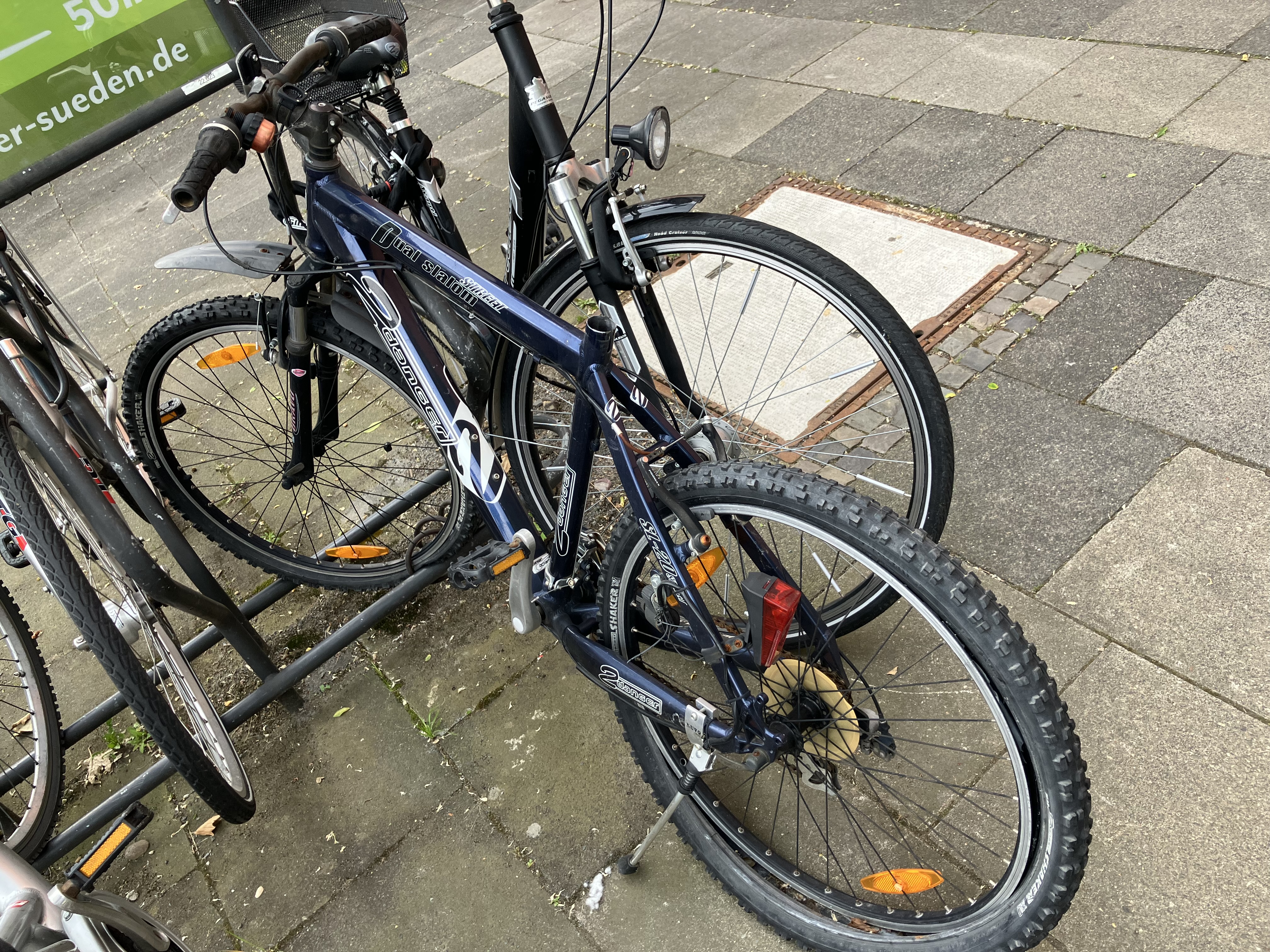 Schrottreifes blaues Mountainbike am Fahrradständer Gottesweg/Ecke Vorgebirgstr.