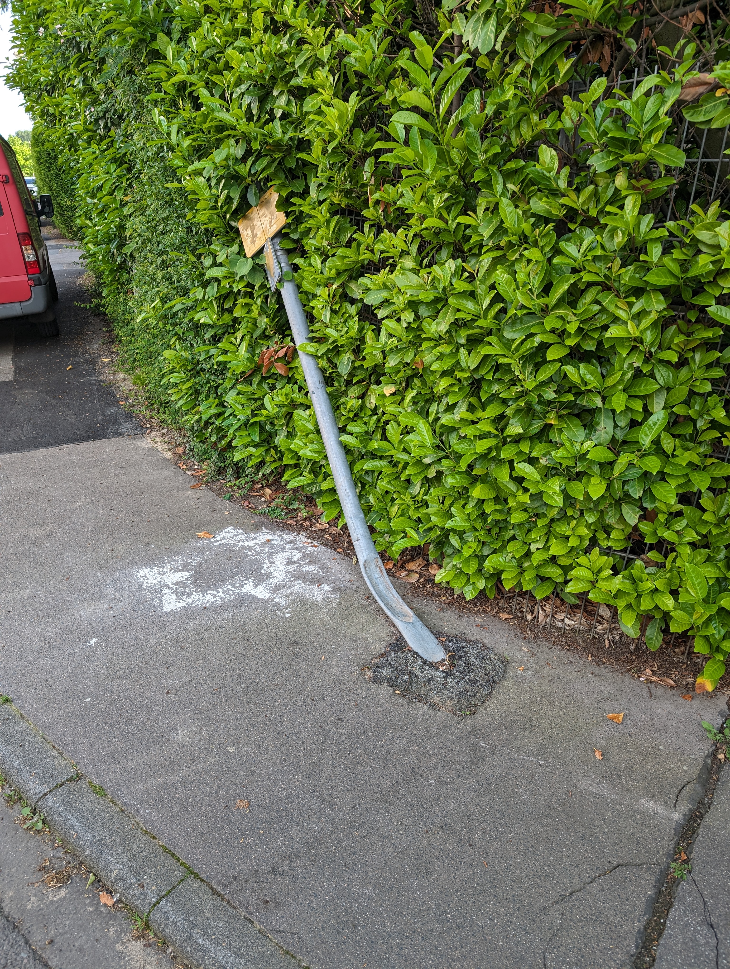 Hinweisschildpfosten zu Straßeneinbauten wurde umgefahren.