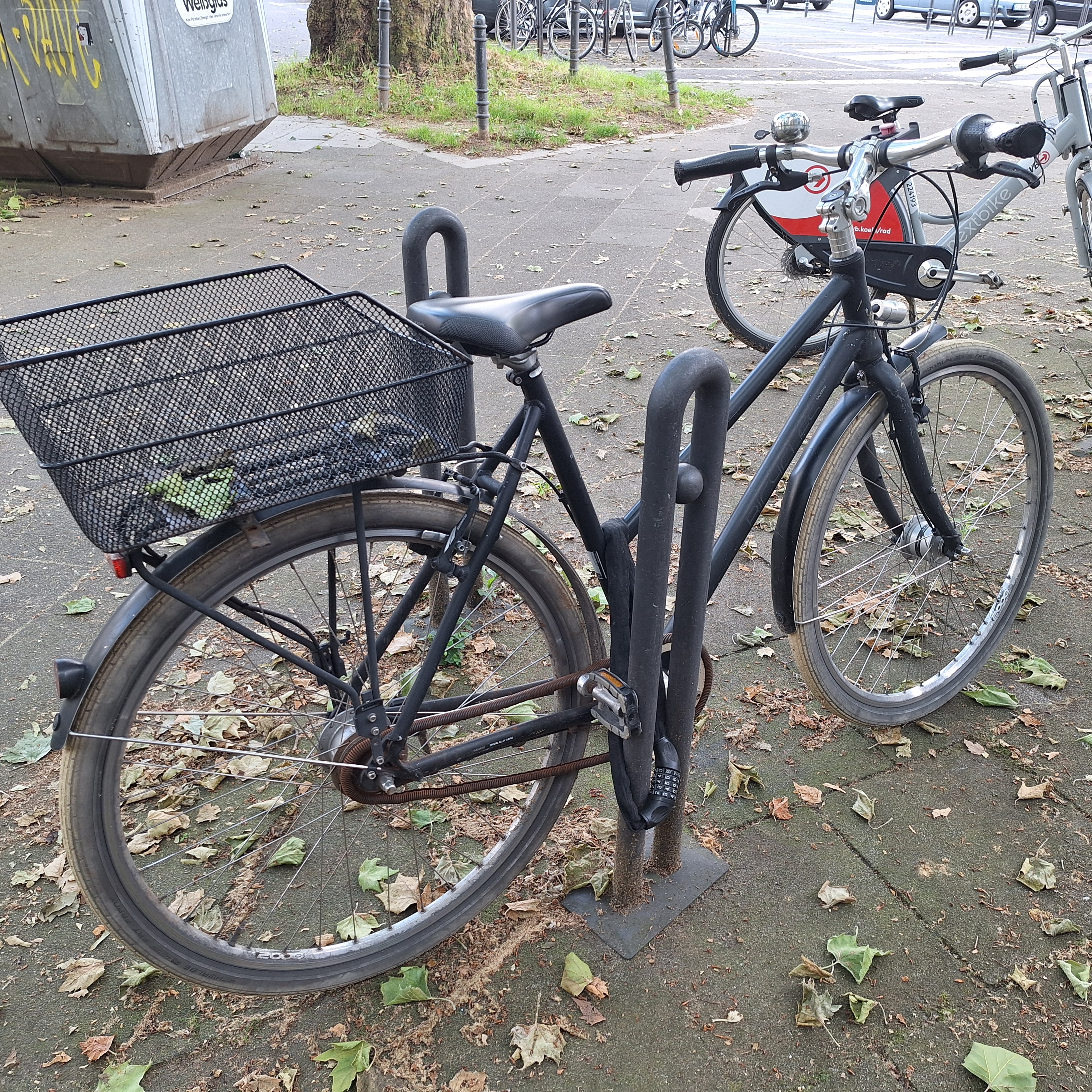Vor ca. Nr. 26 steht ein Schrottfahhrad.