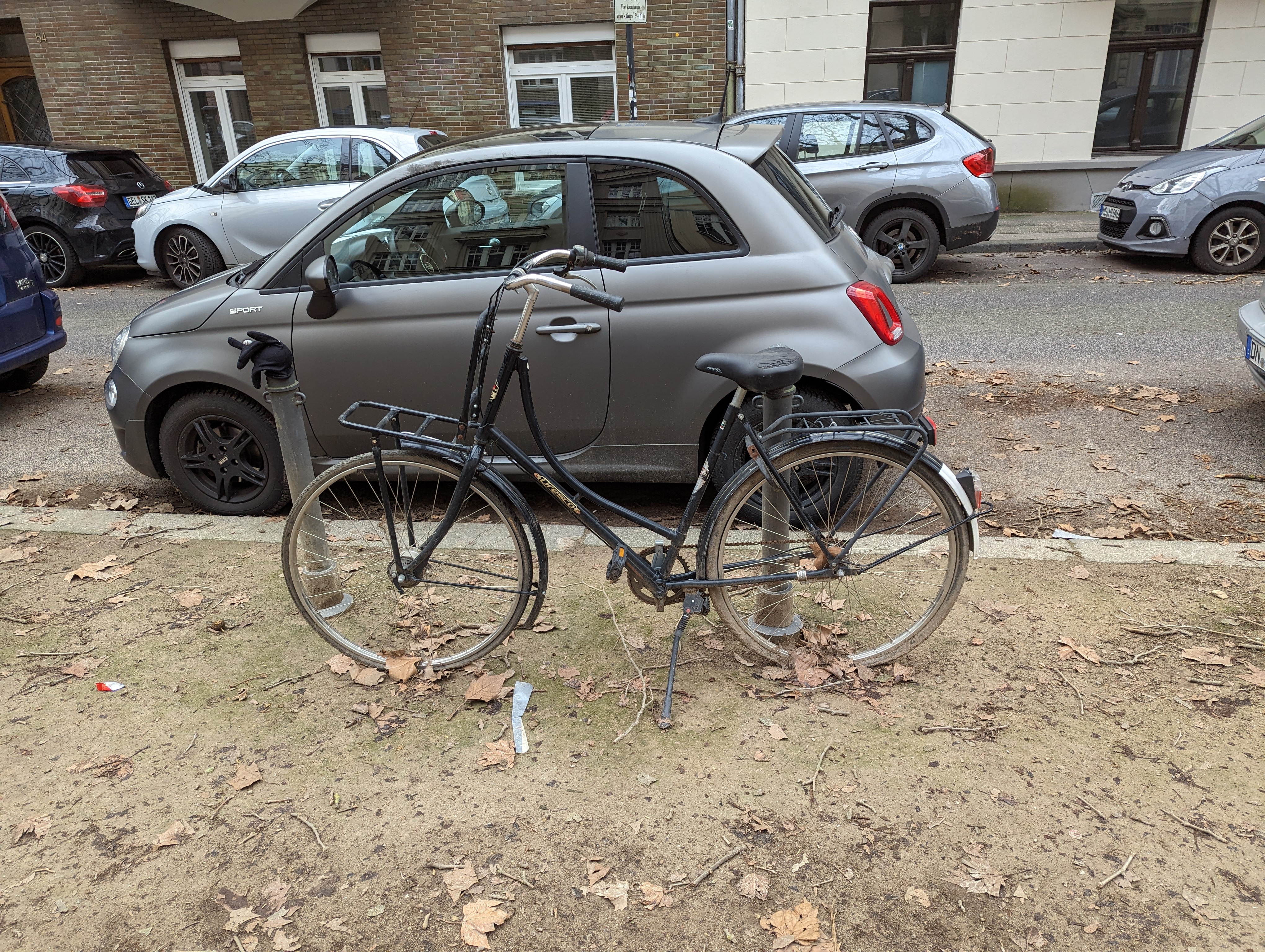 Schrottfahrrad in der Weißenburgstraße, steht dort schon mehrere Wochen, wenn nicht Monate. Vorne und hinten beides Platzen. (Grundsätzlich stehen sehr viele Schrottfahrräder in der Weißenburgstraße, da sollte man grundsätzlich mal aufräumen.)