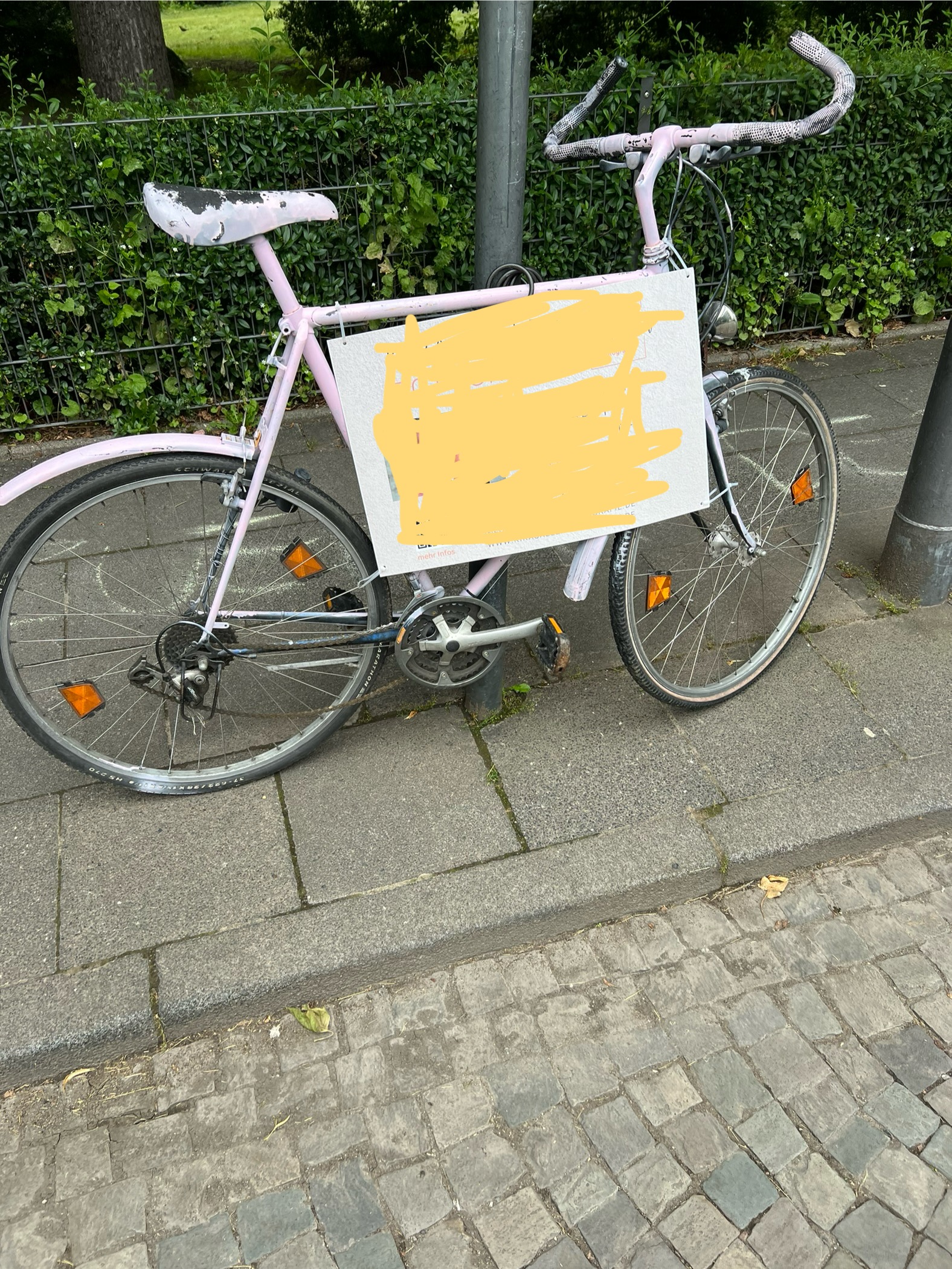 Hässlich bemaltest Werberad; wird nicht zum Radfahren genutzt und blockiert Gehweg. Bitte entsorgen und Kontakt zur Eigentümerin aufnehmen (Kontaktdaten stehen auf dem Schild). Sie schiebt es von A nach B. Wenn das jeder so machen würde …. :-(