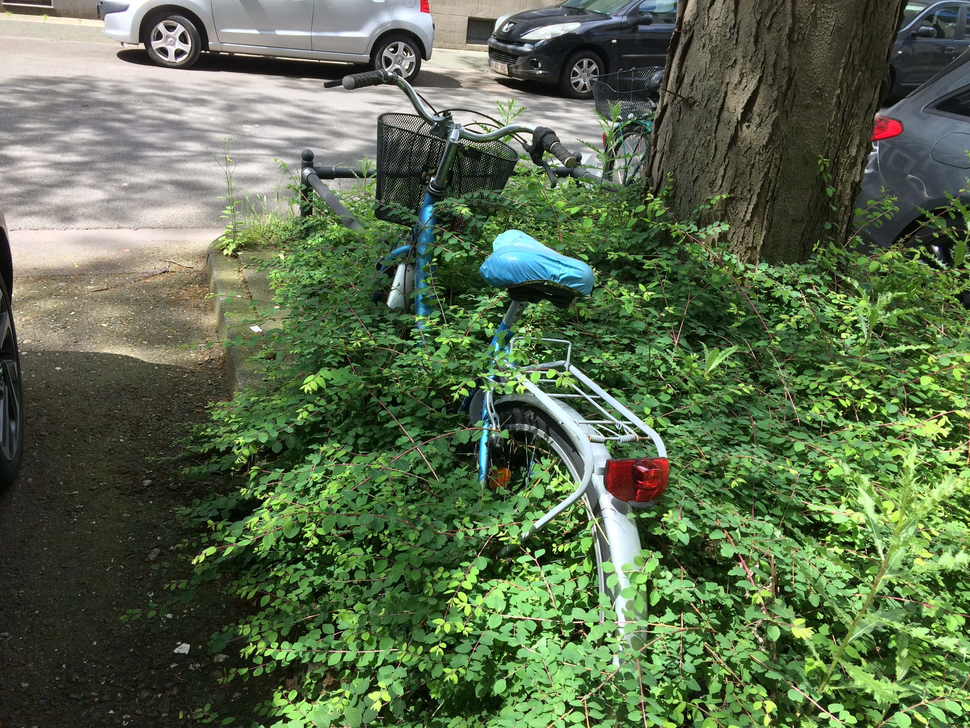 Merheimer Str. 68, 50733 Köln - Hellblaues Fahrrad in an der Baumscheibe verschlossen! Zugewuchert, beide Reifen platt und lange Standzeit (selbsterklärend)!