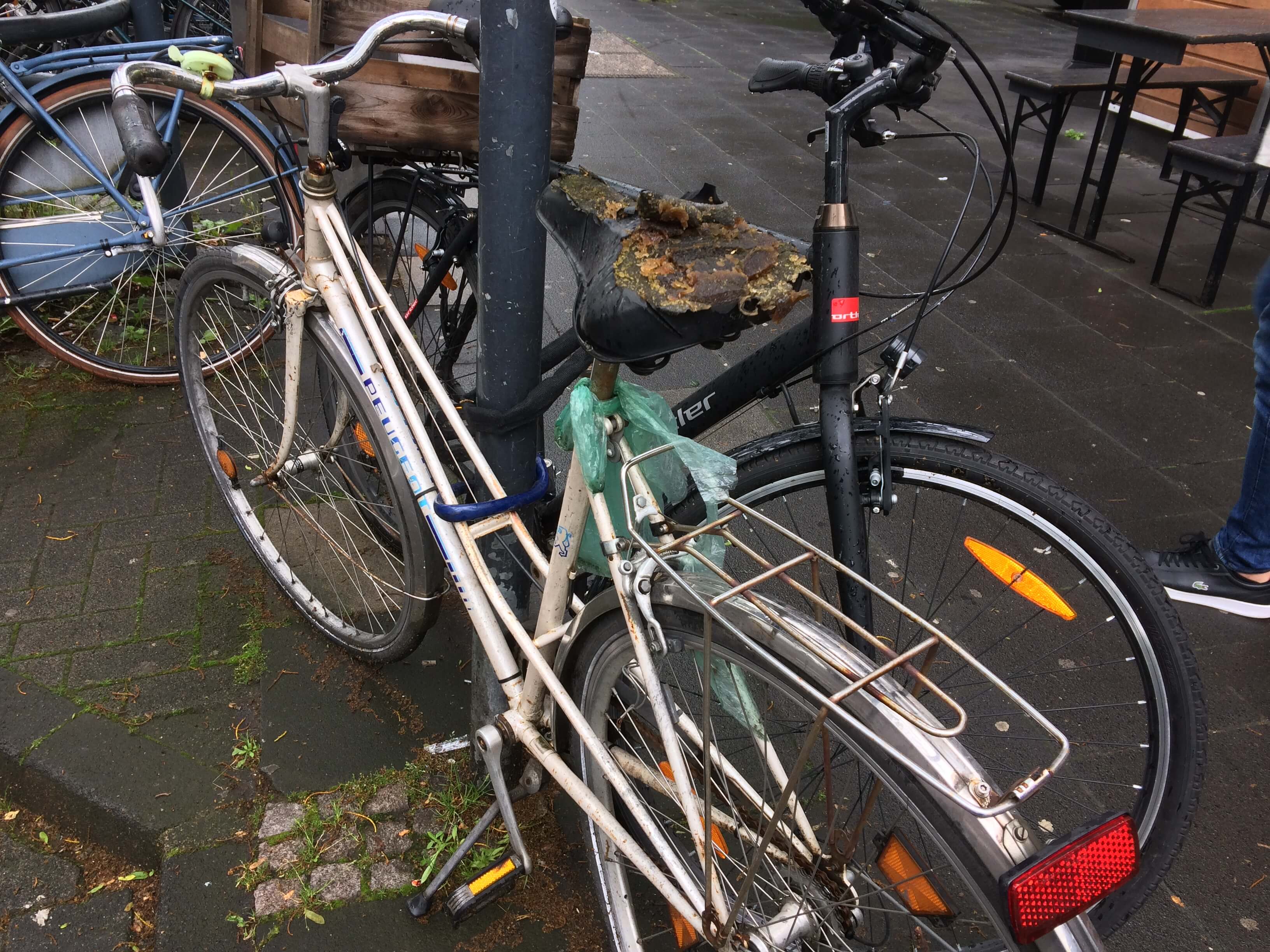 Neusser Str. 217, 50733 Köln - Vor dem bekannten Dönerladen! 😊 Weißes "Peugeot"-Fahrrad, Fahrradrahmen an einem Pfosten verschlossen! Vorder- und Hinterrad platt, Hinterrad hat eine sog. "Acht", Sattel löst sich in seine chemischen Elemente auf und hat eine lange Standzeit! Herr Podolski möchte in Zusammenarbeit mit Herrn Murjahn den Metallschrott endlich entfernt haben! - "Das sieht aber nicht schön aus!"