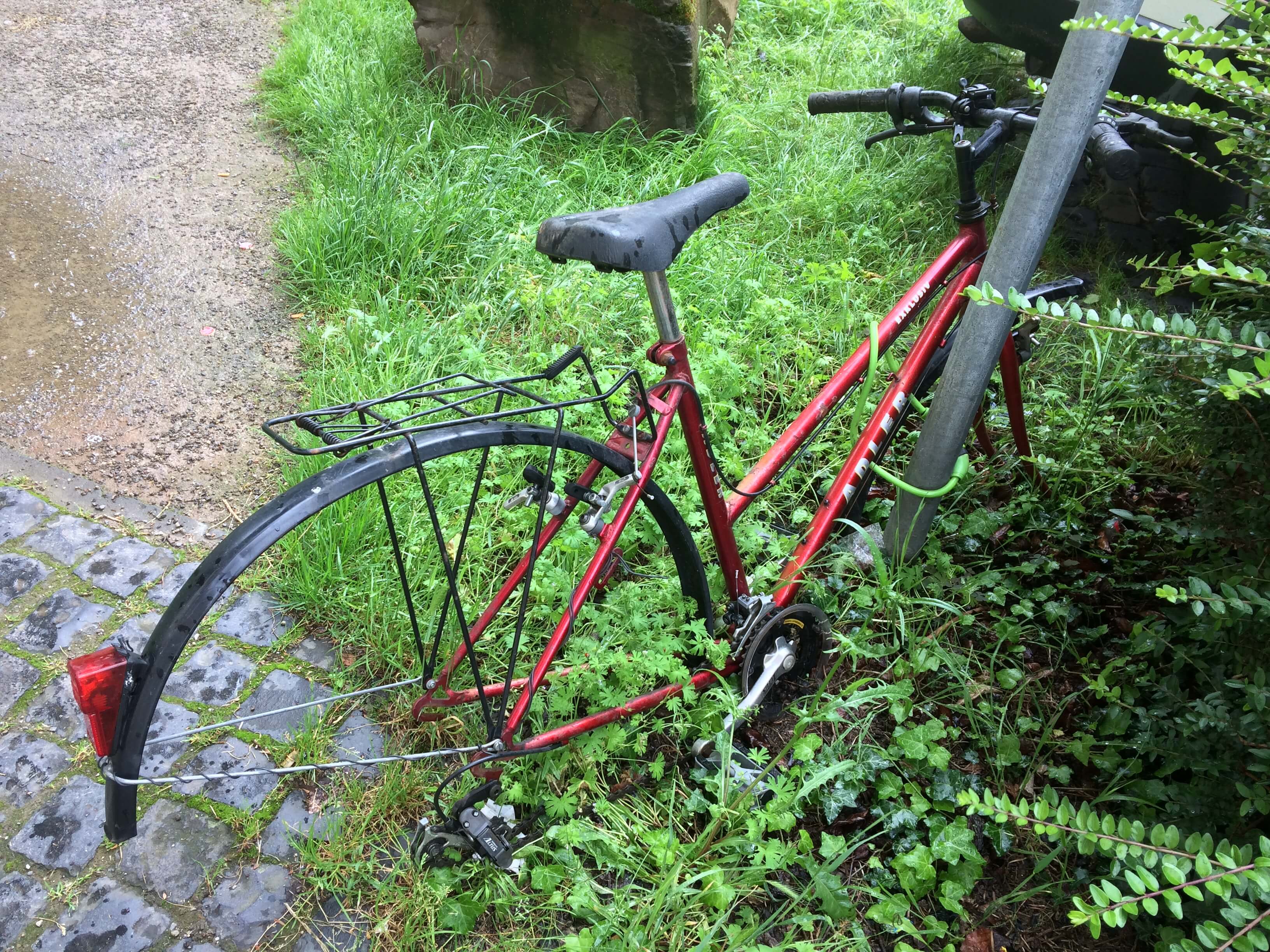 Steinbergerstr. 15, 50733 Köln - Befindet sich auf der Wiese bzw. an dem Schild "Betreten mit Hunden verboten"! Rotes "Adler"-Fahrrad bzw. nur noch der Rahmen! Standzeit ca. 2,5 Jahre! Vorder- und Hinterrad fehlen!