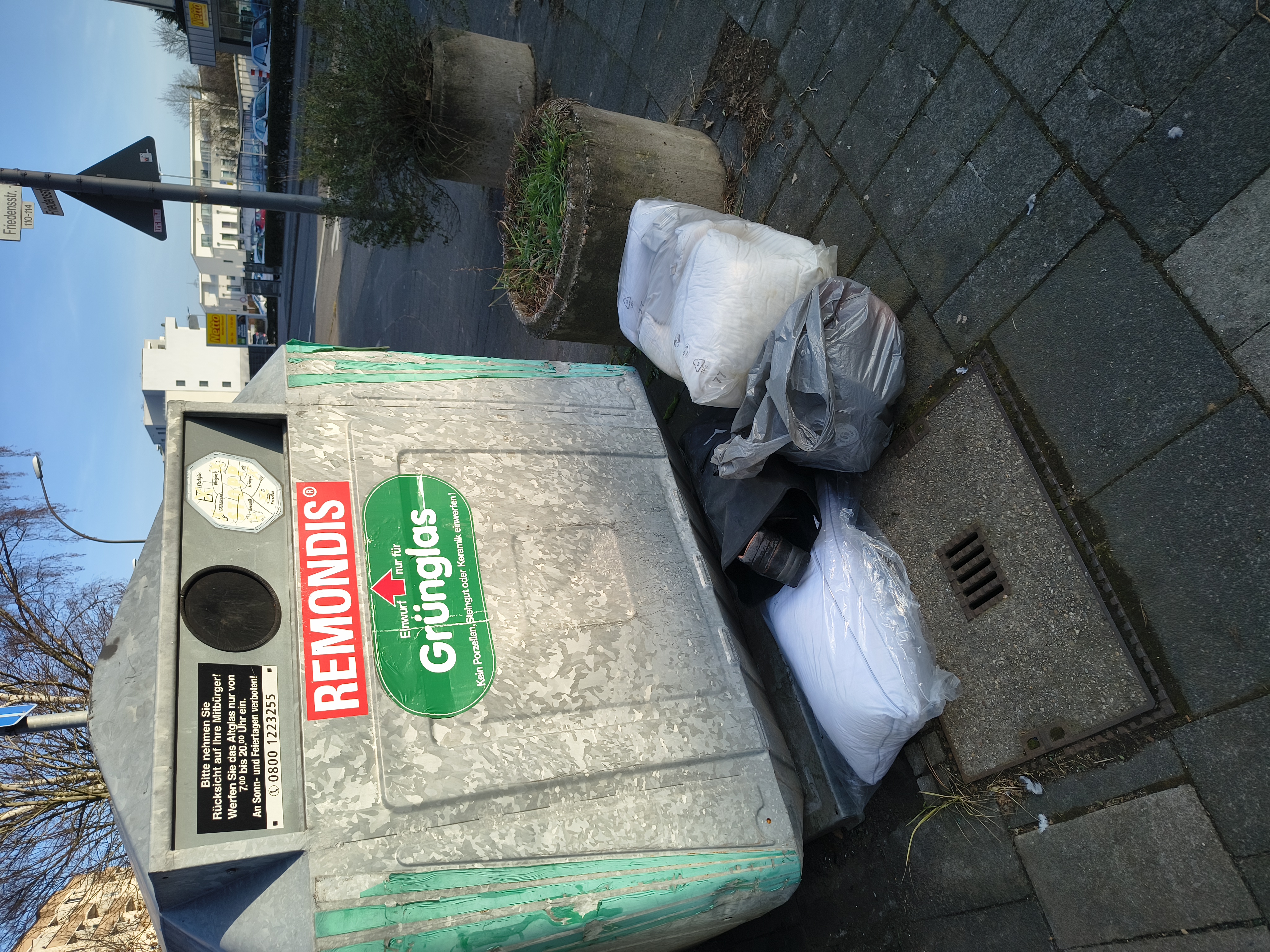 Wilder Müll (Säcke mit div. Unrat) vor/neben den dort. Glascontainern.