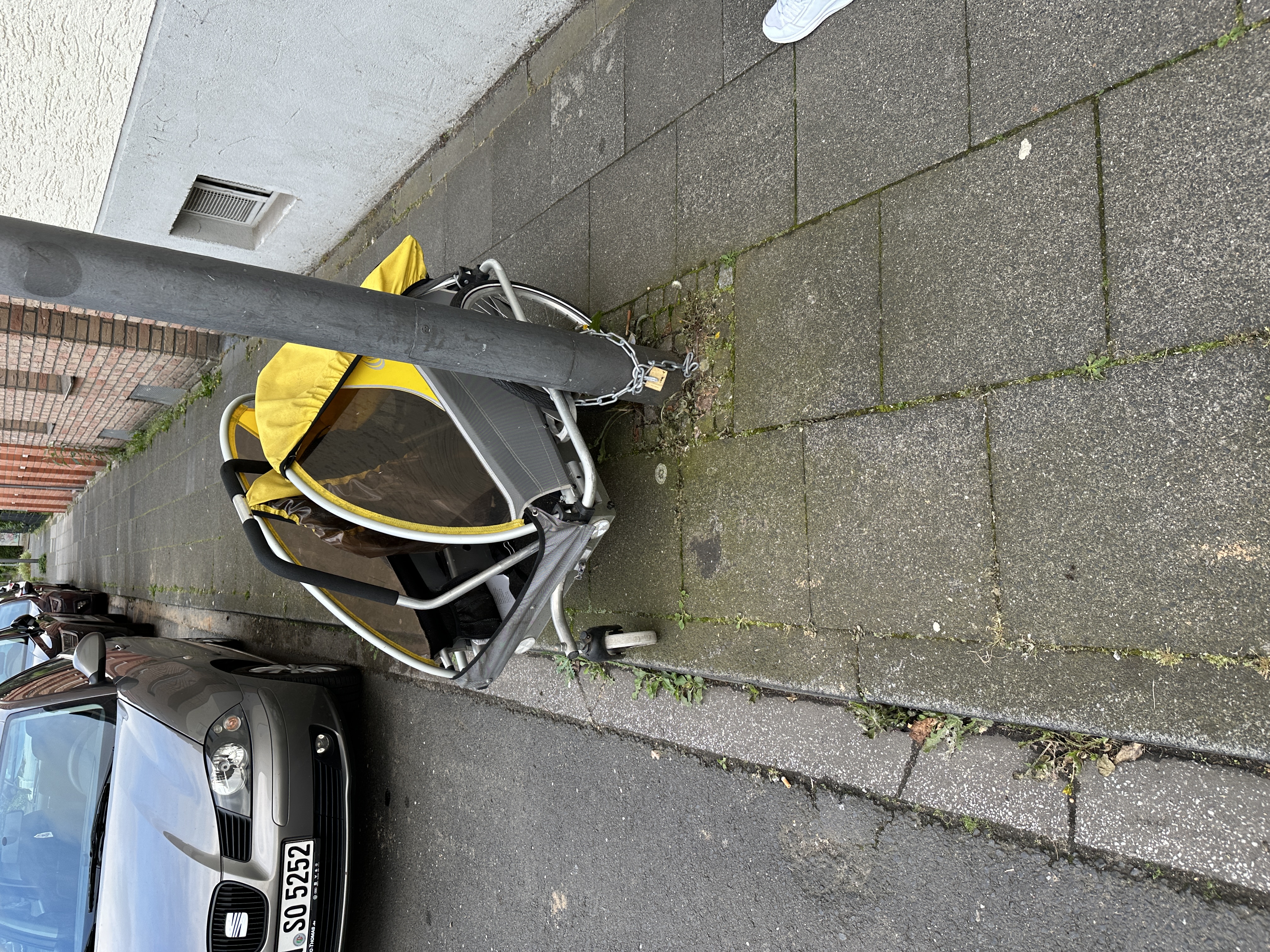Seit Wochen steht der fahrradsnhänger bei uns in der Straße zwischen der Elisenstraße 67 und 71
