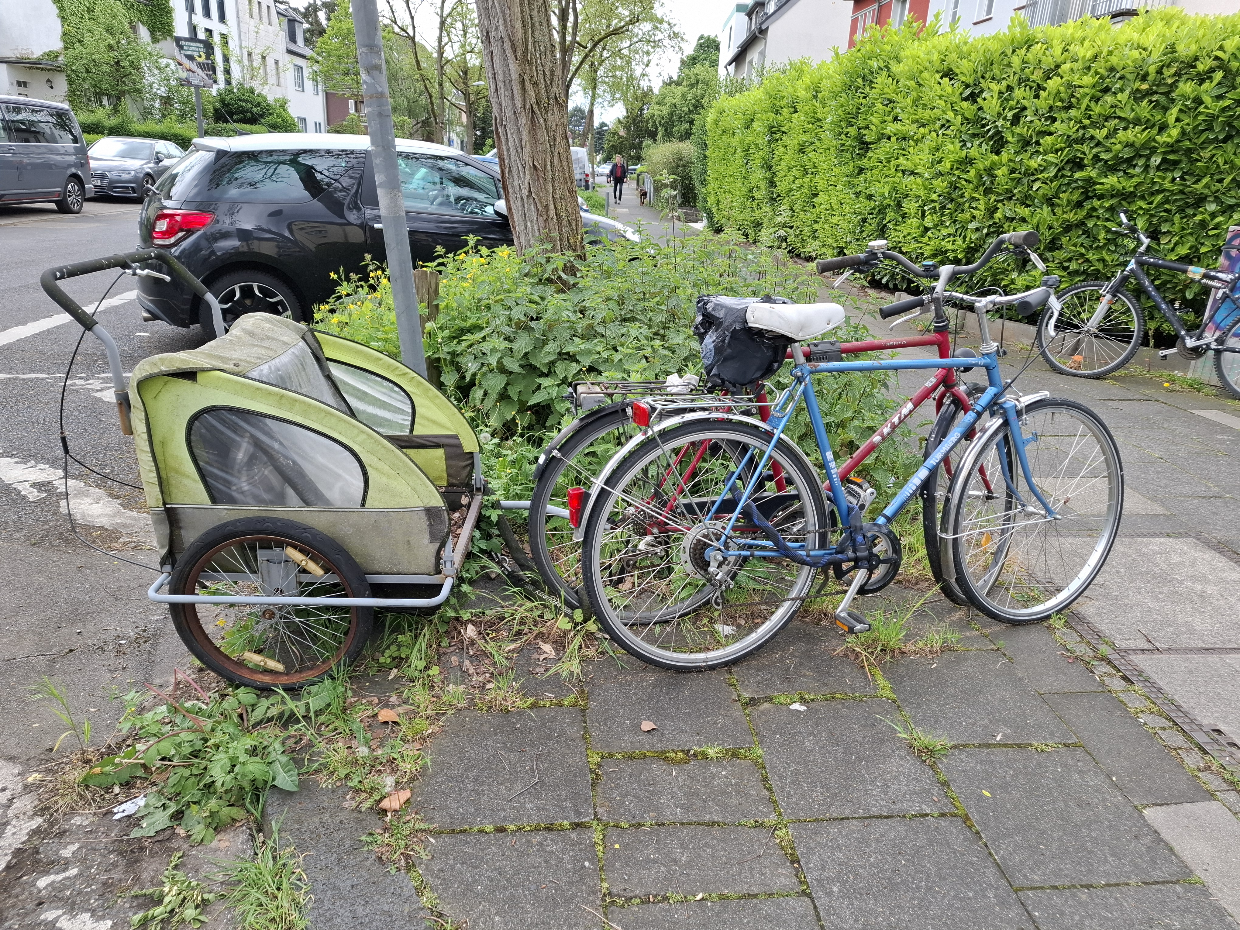 An der Ecke Siebengebirgsallee/Lohrbergstraße stehen die 2 Räder, eins mit Anhänger, seit langer Zeit. Nicht mehr fahrtüchtig...