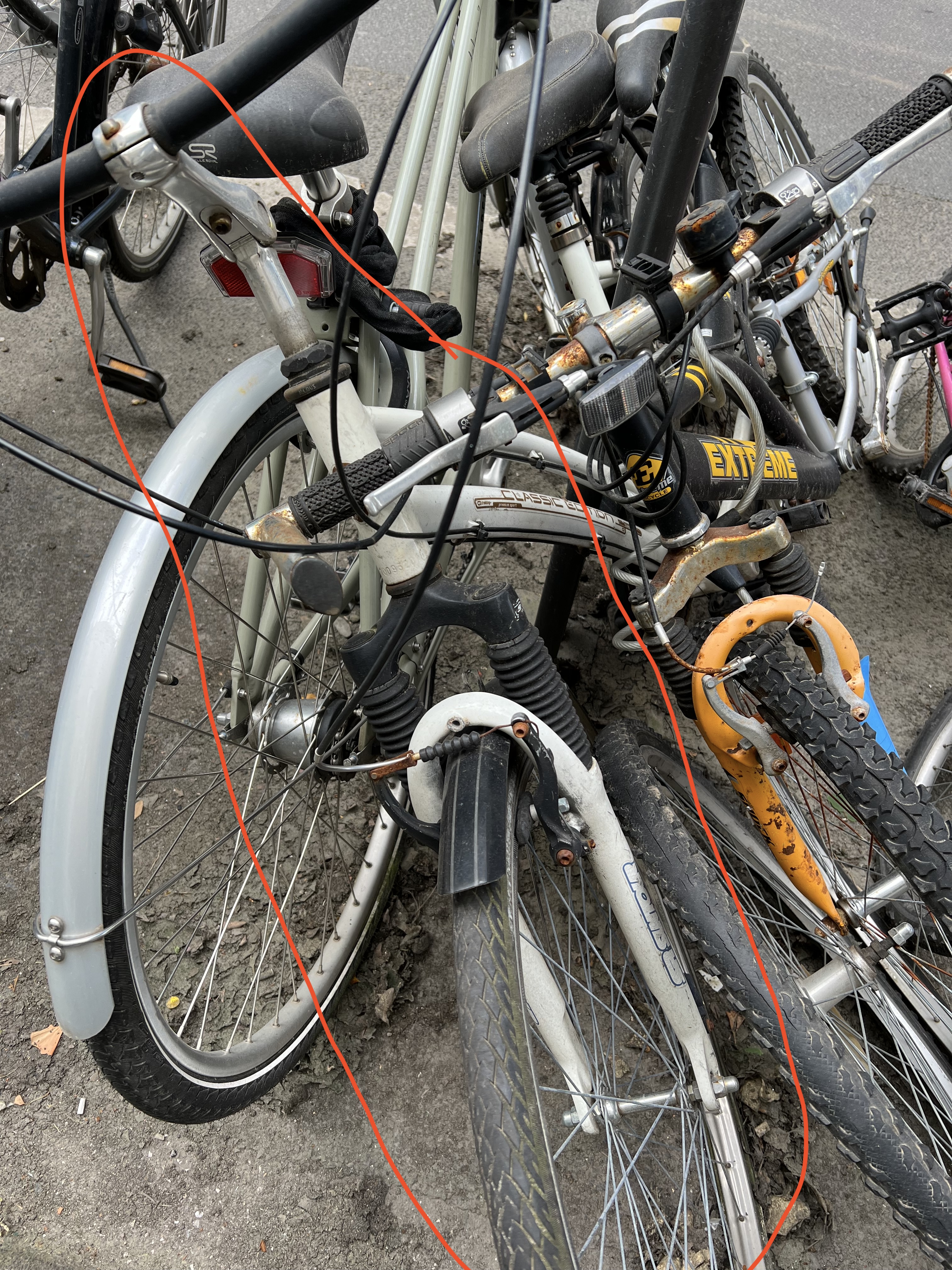 seit vielen Monaten ist dieses weiße Fahrrad angekettet unter einem anderen und liegt quer zwischen den Pollern, so dass es verhindert, dass Einwohner oder Besucher sich anketten können. Könnten Sie das Fahrrad entfernen, es wurde hier liegengelassen. das Fahrrad hat keine Lichter mehr vorne und hinten und verkommt.