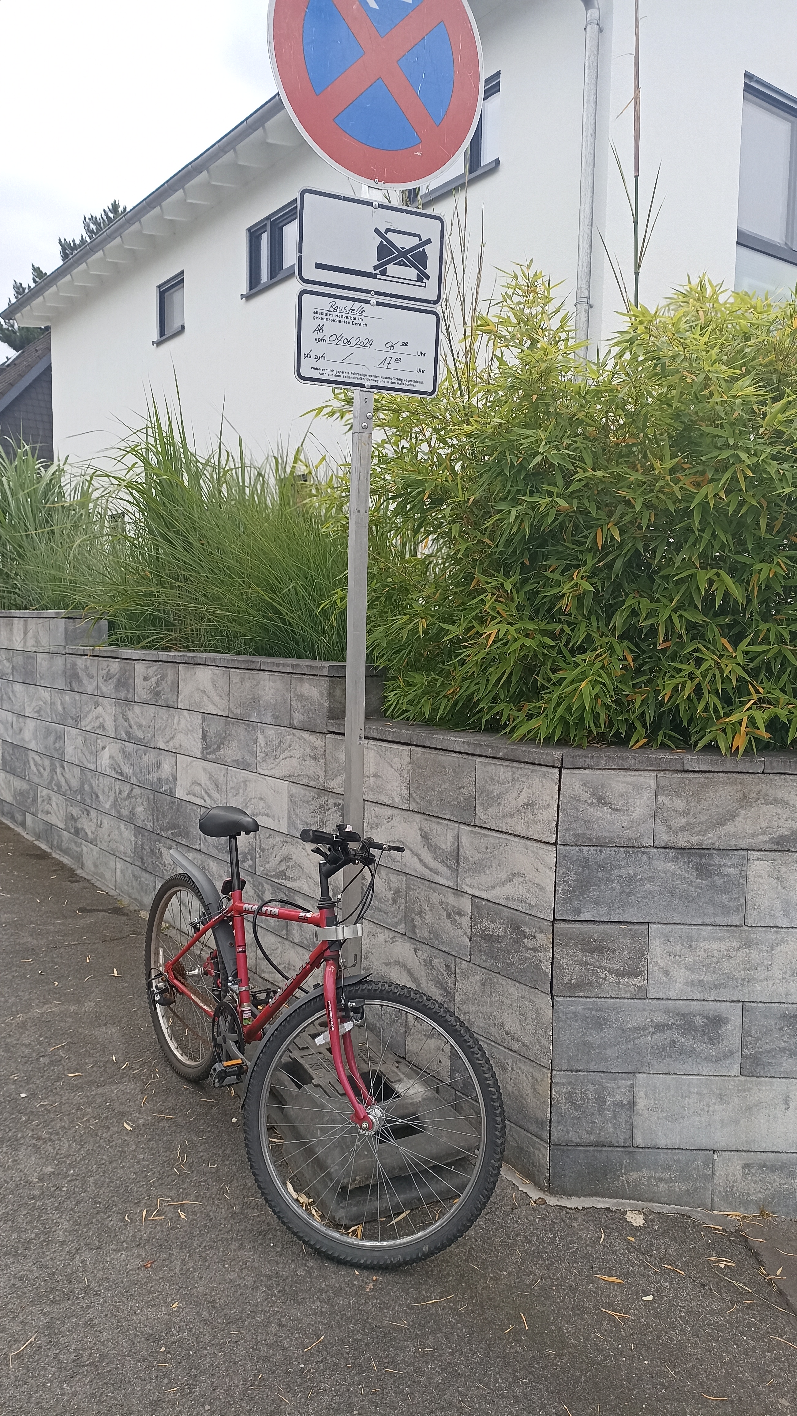 Guten Tag, seit mind. 1 Woche steht ein altes Fahrrad an einem portablen Verkehrsschild (wg. Baustelle) angekettet auf dem Gehweg und versperrt diesen teilweise. Da es in dieser Zeit nicht benutzt wurde, ist anzunehmen, dass es dort rechtswidrig abgestellt worden ist.
