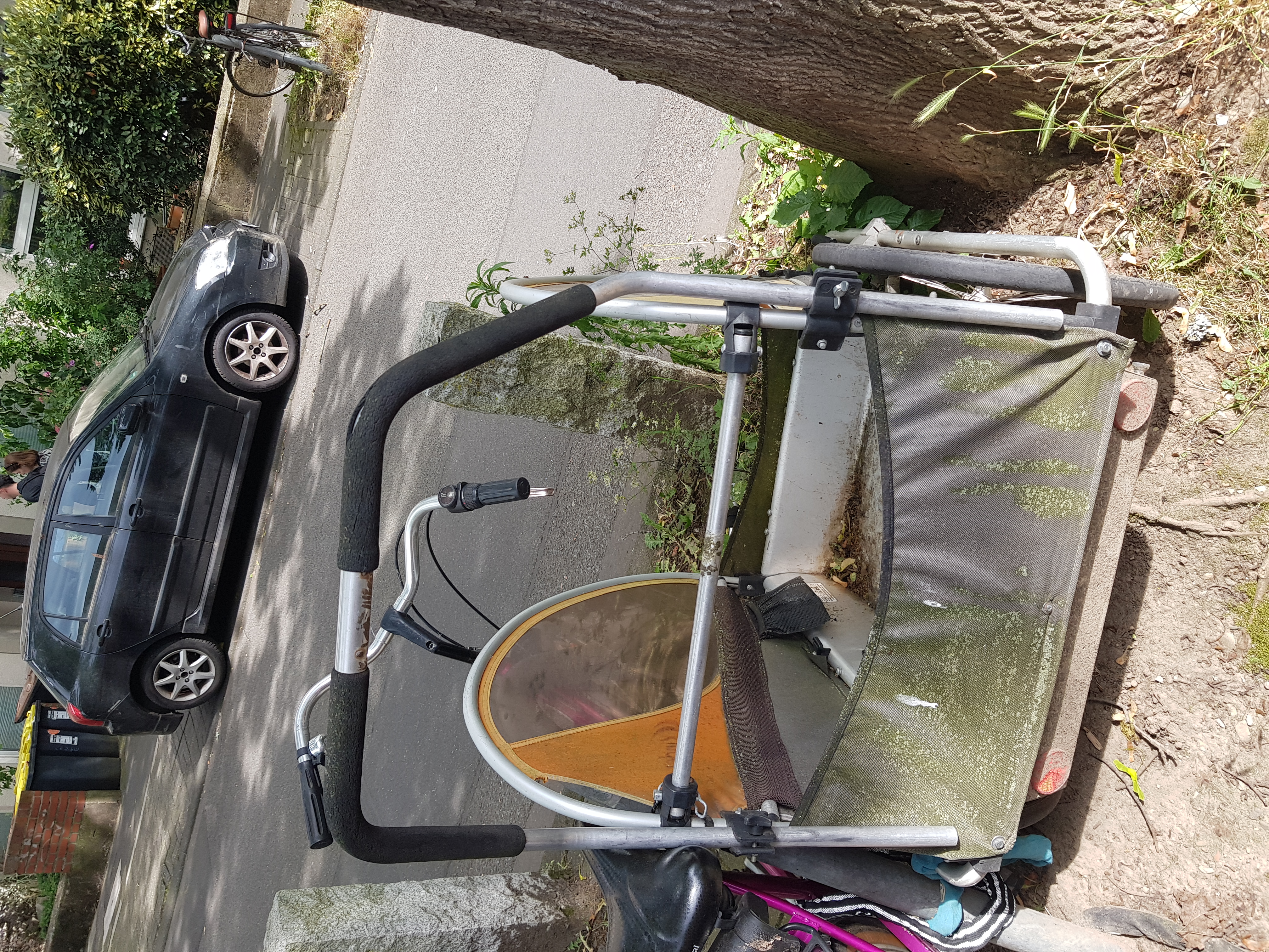 Ottostraße 70 Ehrenfeld - aber davon gegenüber an der roten Mauer des jüd. Elternheims steht seit mind. ca. 3 Jahren ein uralter, moosiger Kinderfahrradanhänger. Es ist ein Schrottanhänger.