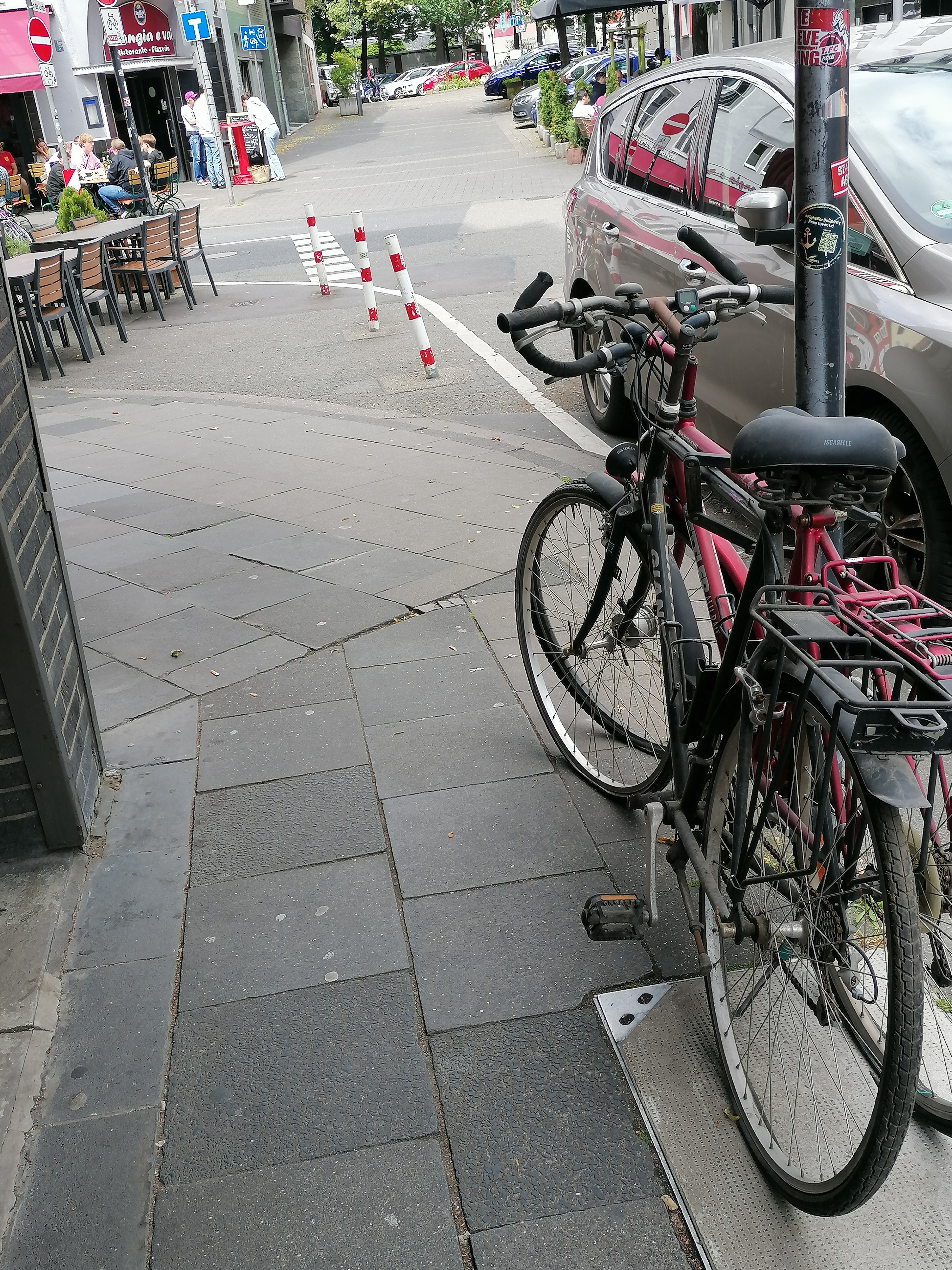 Direkt vor einen Restaurant Fenster und verengt den Bürgersteig für Rollstuhl und Kinderwagen.