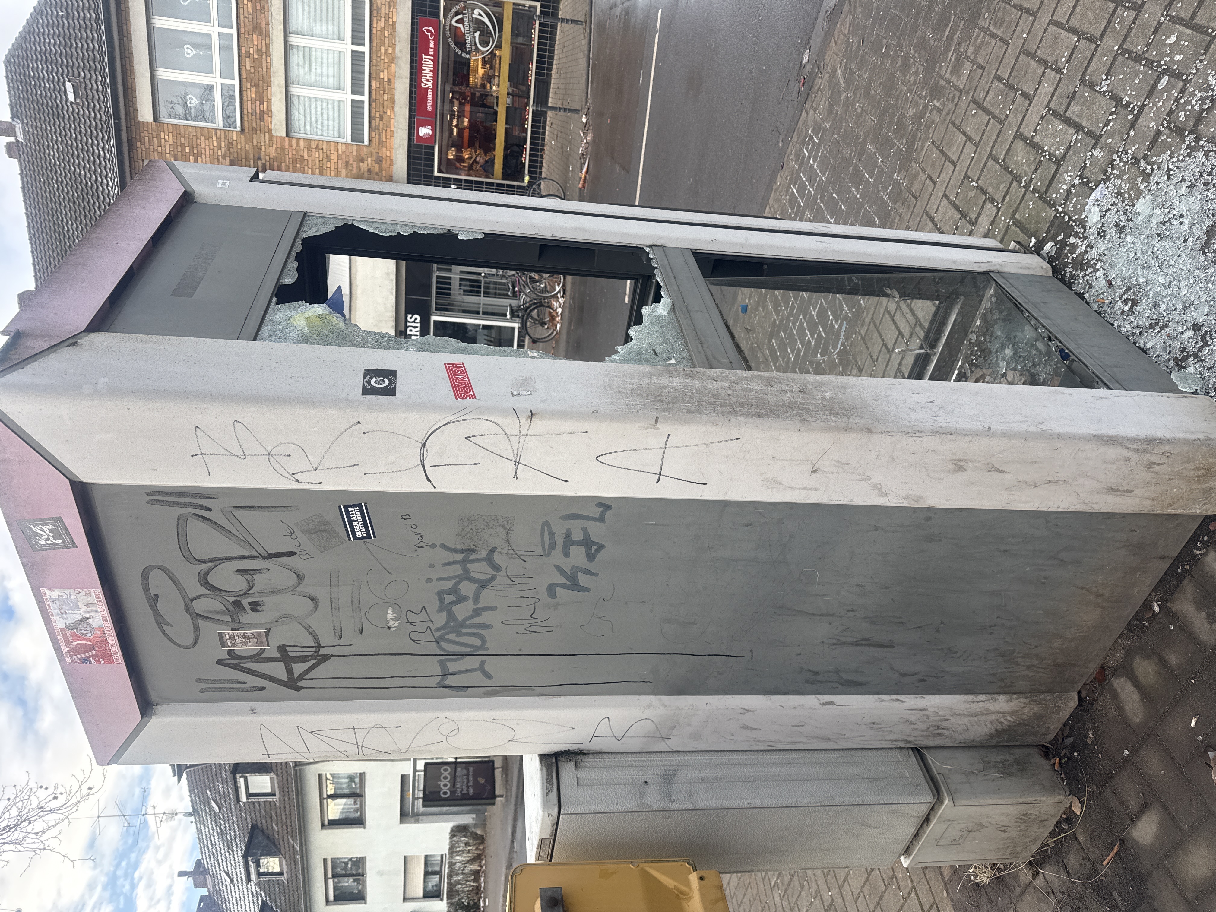 Nach Prüfung Ihrer Meldung wurde festgestellt, dass die betroffene Fläche kein öffentliches Eigentum ist. Das Objekt befindet sich in Besitz der Telekom. Das Unternehmen ist für eine eventuelle Reinigung sowie Strafverfolgung selbst verantwortlich.