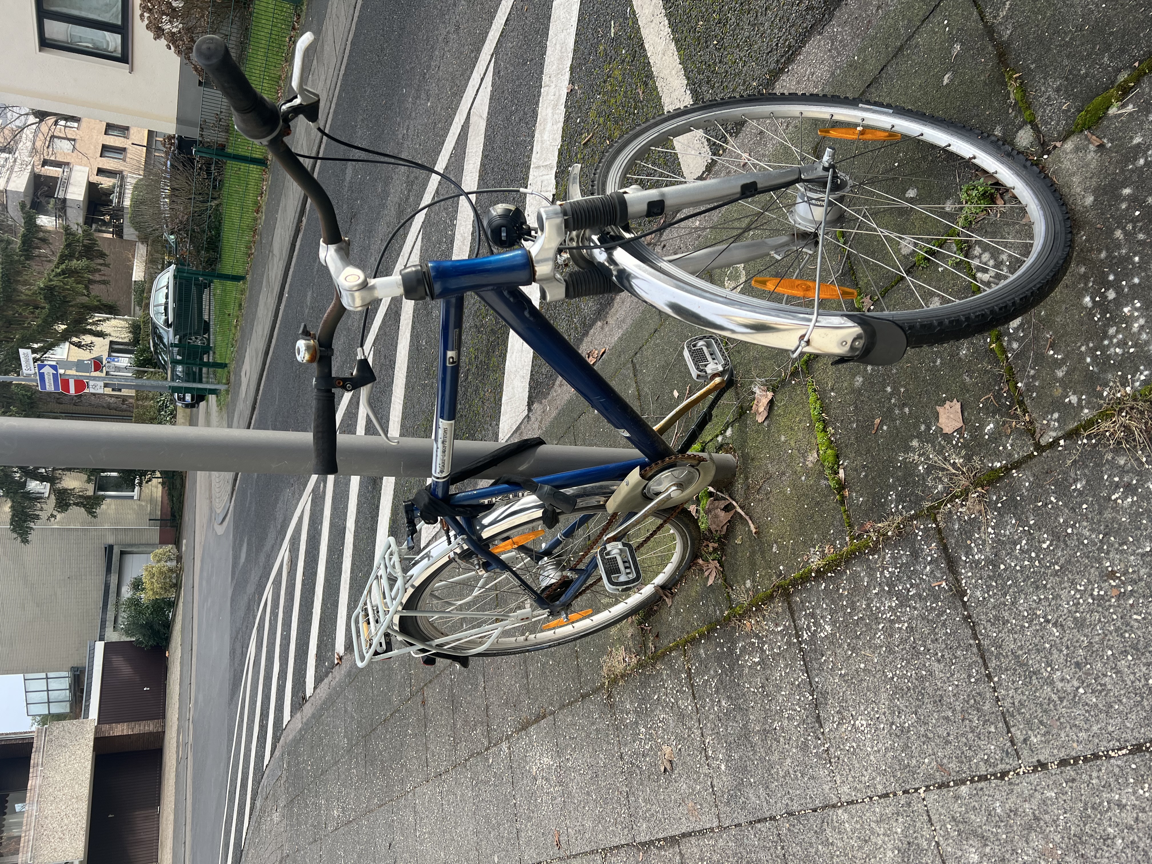 Herrenloses Fahrrad ohne Sattel rostet seit vielen Monaten an einer Laterne angekettet vor sich hin. Stört nicht nur optisch, sondern auch zum Teil auf dem Gehweg. Reifen hinten ist ebenfalls seit Monaten platt.