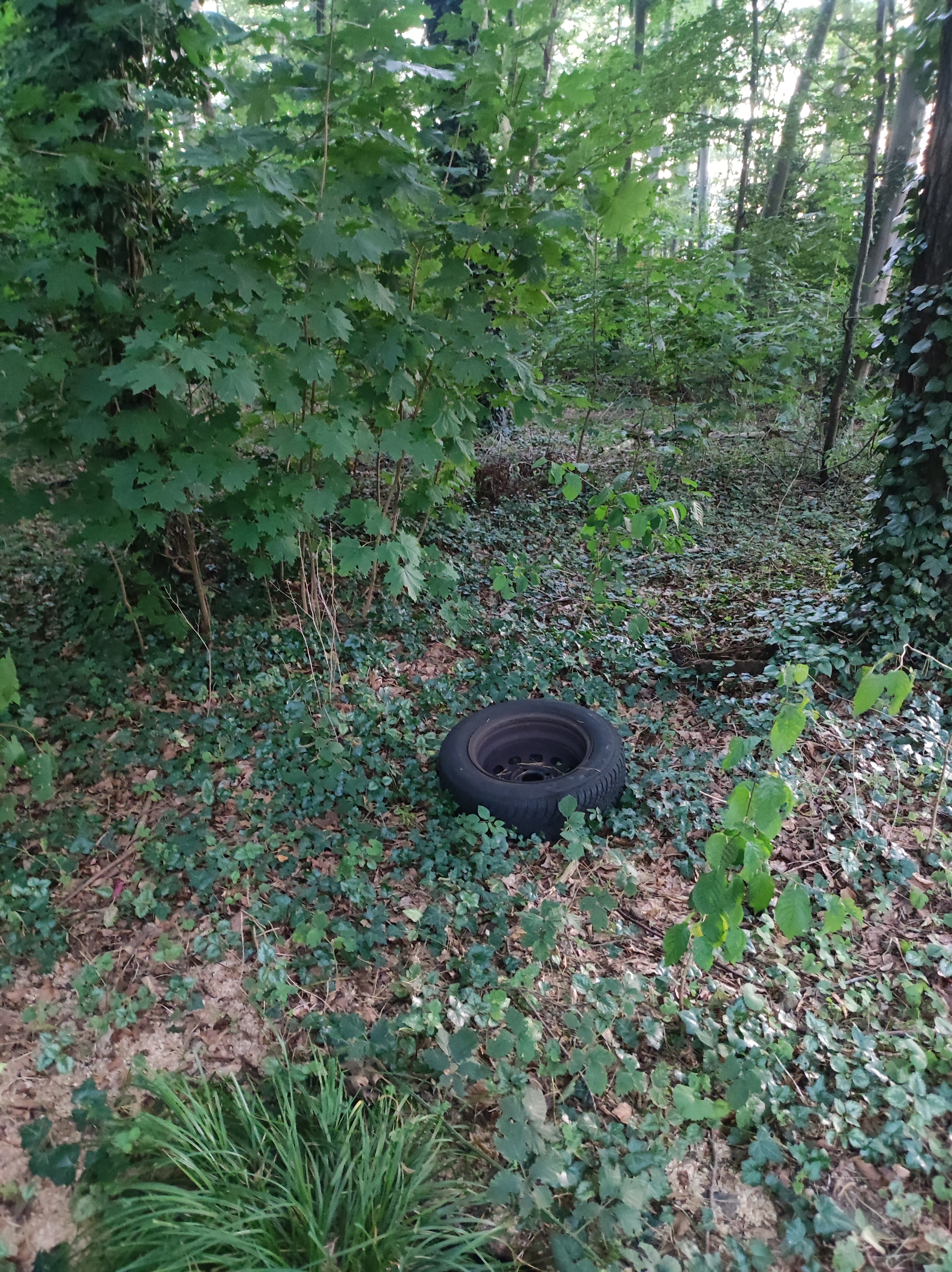 Am Waldrand, ca. gegenüber der Einfahrt zum Tennisplatz, liegen mehrere Autoreifen im Unterholz.