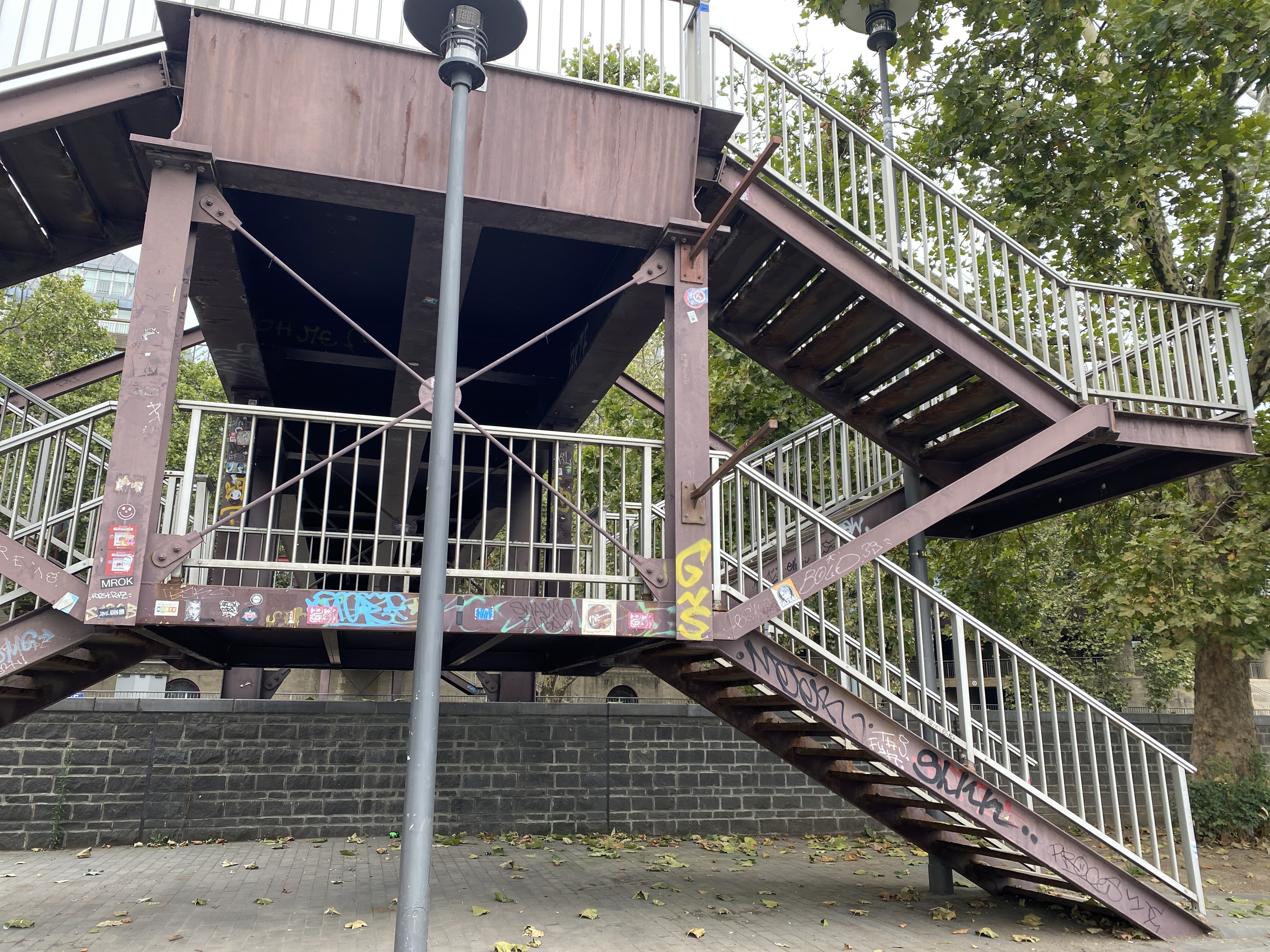 Ich möchte meine Meldung von eben korrigieren: Der gigantische Kothaufen liegt nicht an, sonder AUF der Treppe vom Maritim-Hotel zum Rheinufer. Vom Rheinufer auf die Treppe schauend befindet er sich auf der rechten Seite.