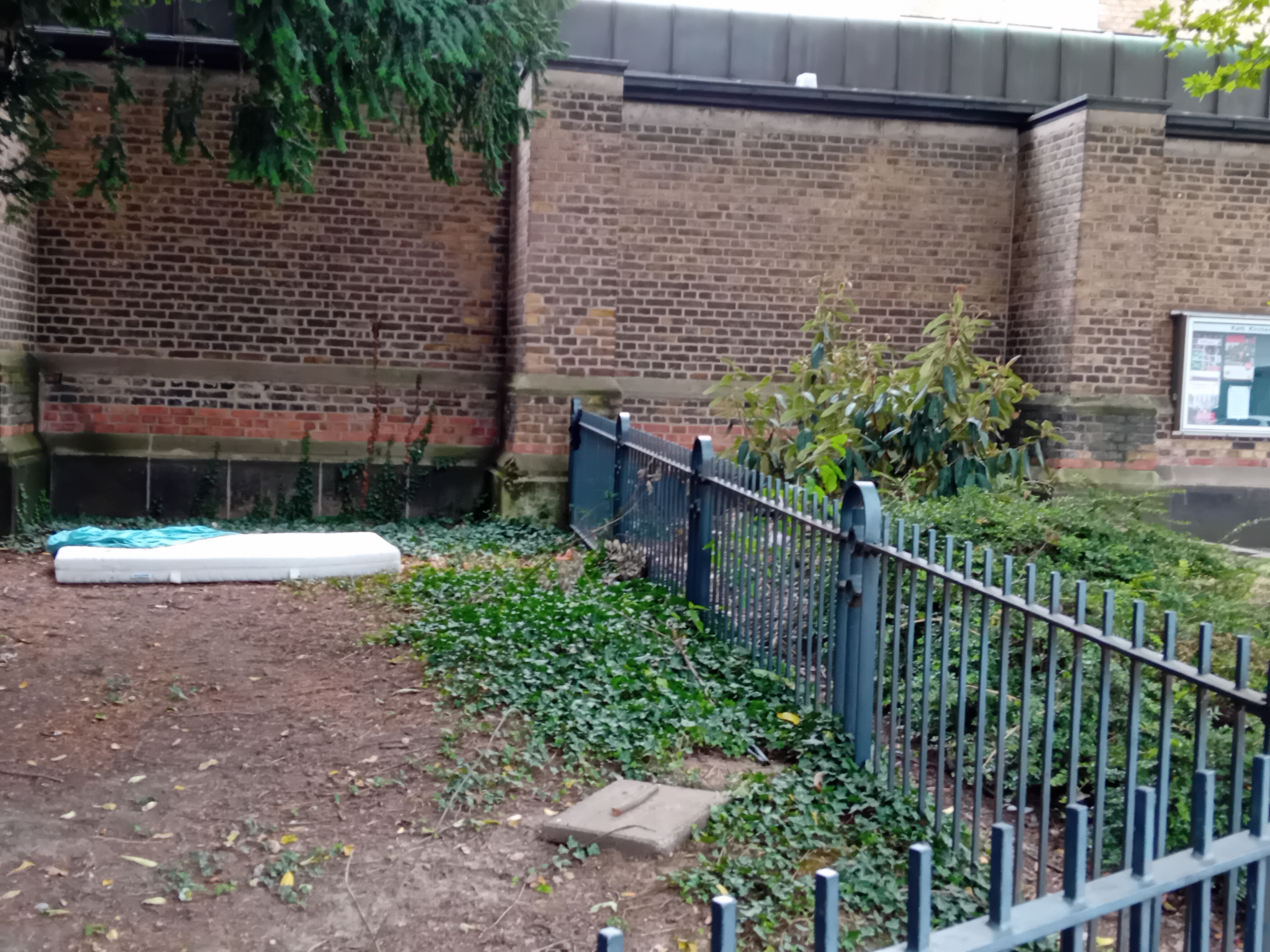 Im Eingangsbereich der Mauritiuskirche in dem umzäunten Bereich liegt eine Matratze, vermutlich von Drogengebrauchern dorthin gebracht