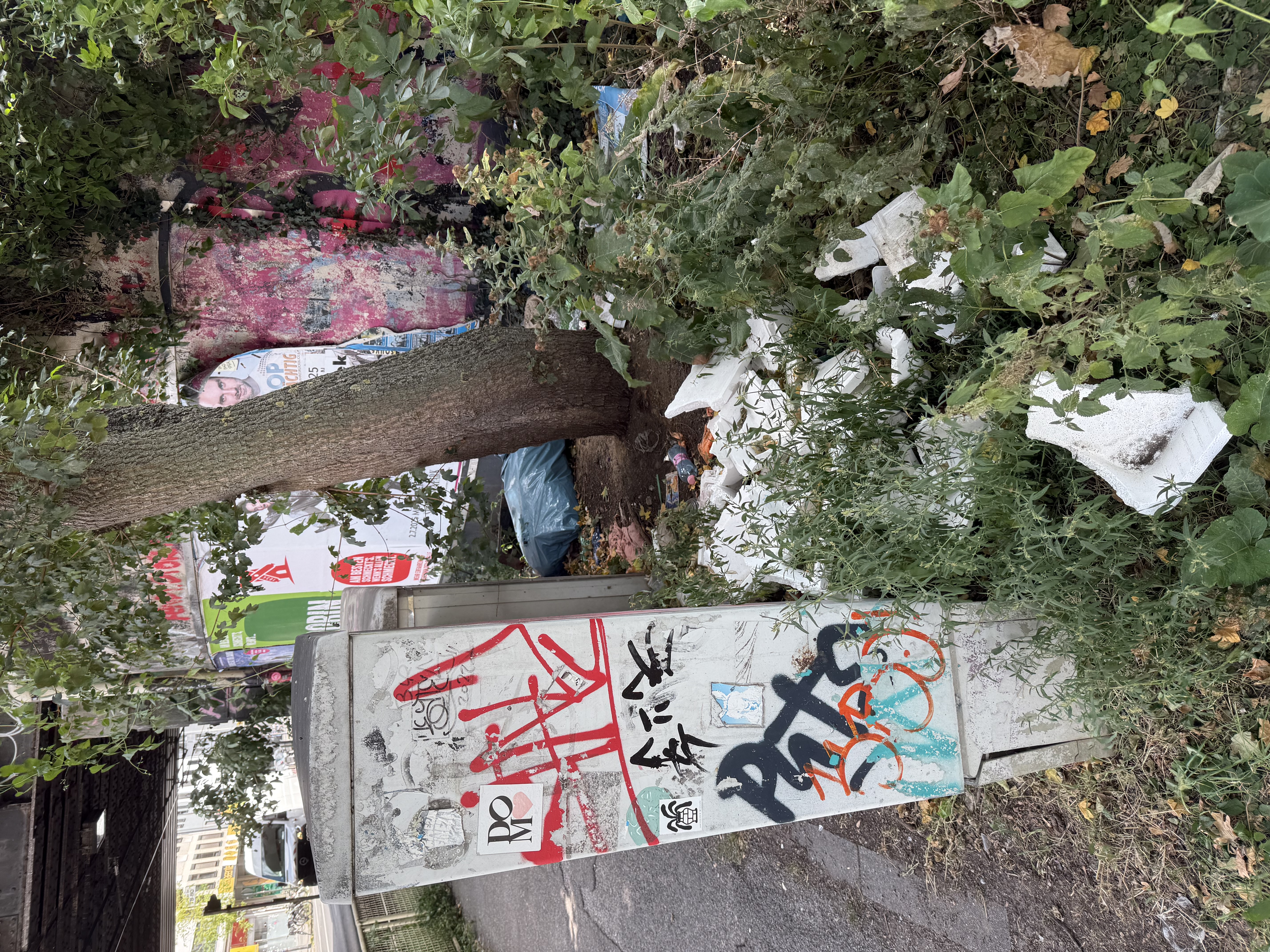 Seit längerer Zeit liegen hinter dem Strom-/Verteilerkästen an der Eisenbahnbrücke an der Aachener Str., Styropor, Müllbeutel und Plastikflaschen.