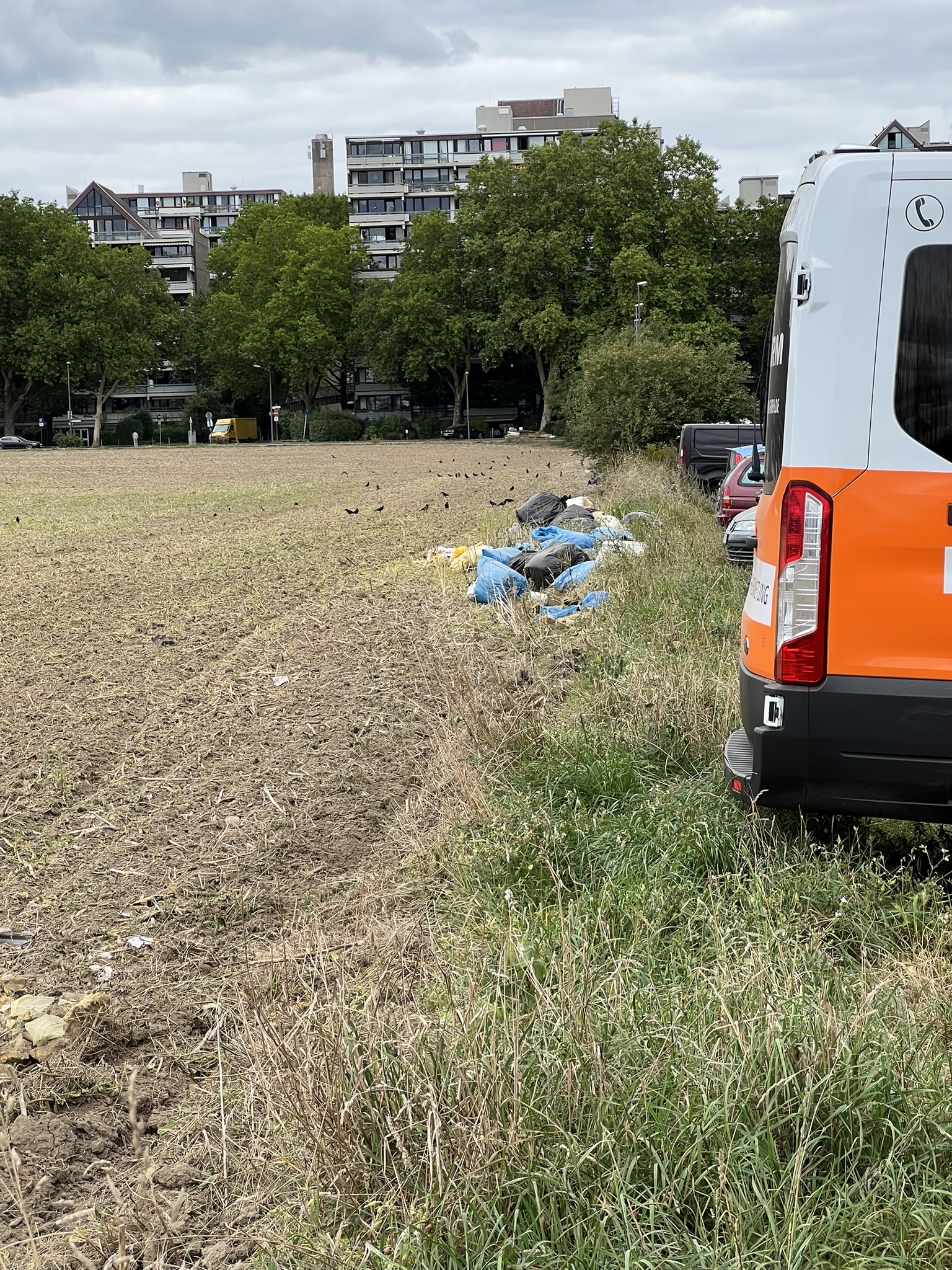 Diverser Müll in Abfallsäcken hinter der Parkplätzen am Feldrand.