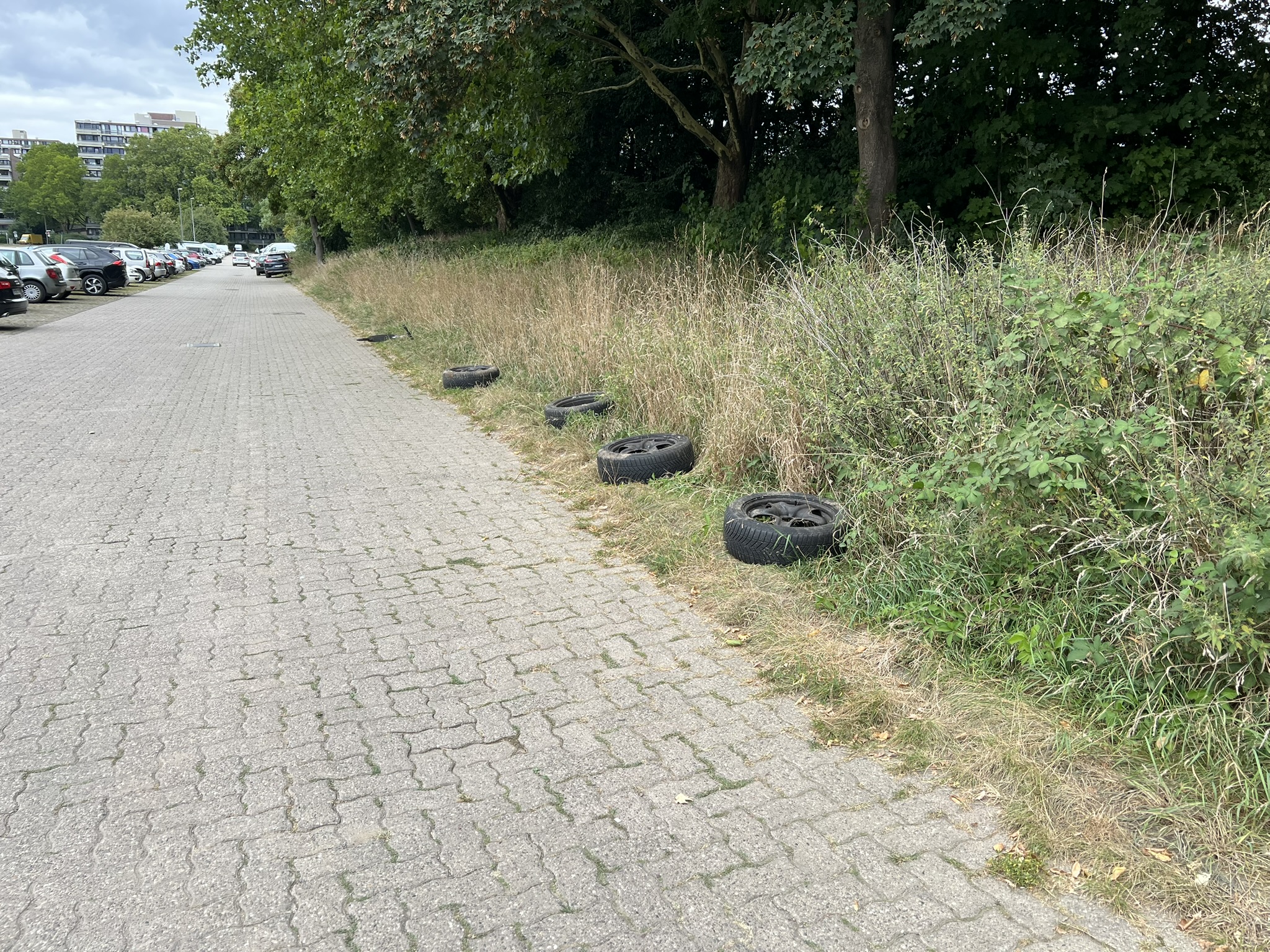 Gegenüber der Parkplätze am Wegrand 4x Autofelgen/Reifen entsorgt