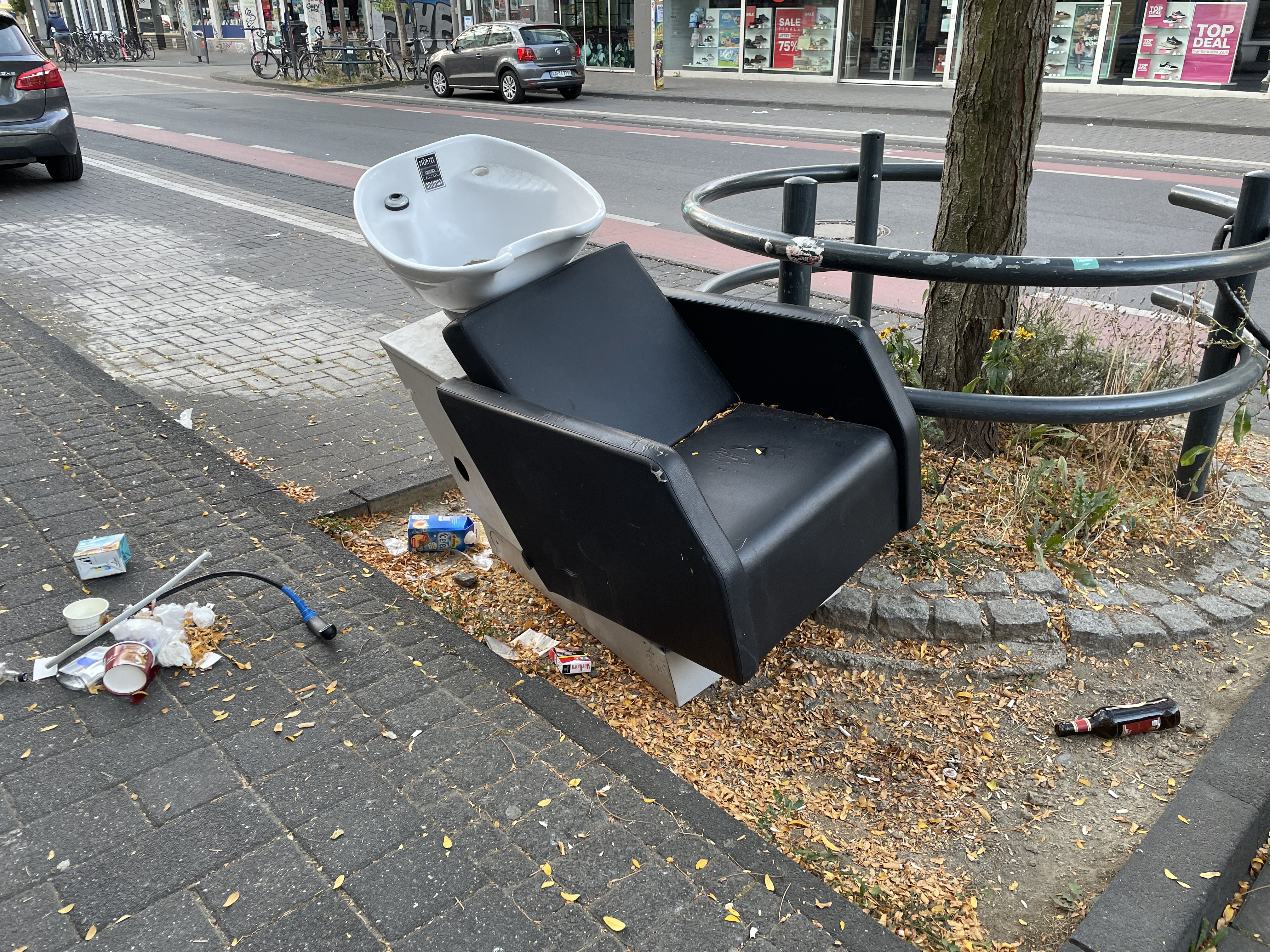 Ausrangierter Friseurwaschtisch steht seit Wochen auf der Baumscheibe - direkt vor dem Friseurladen!!!