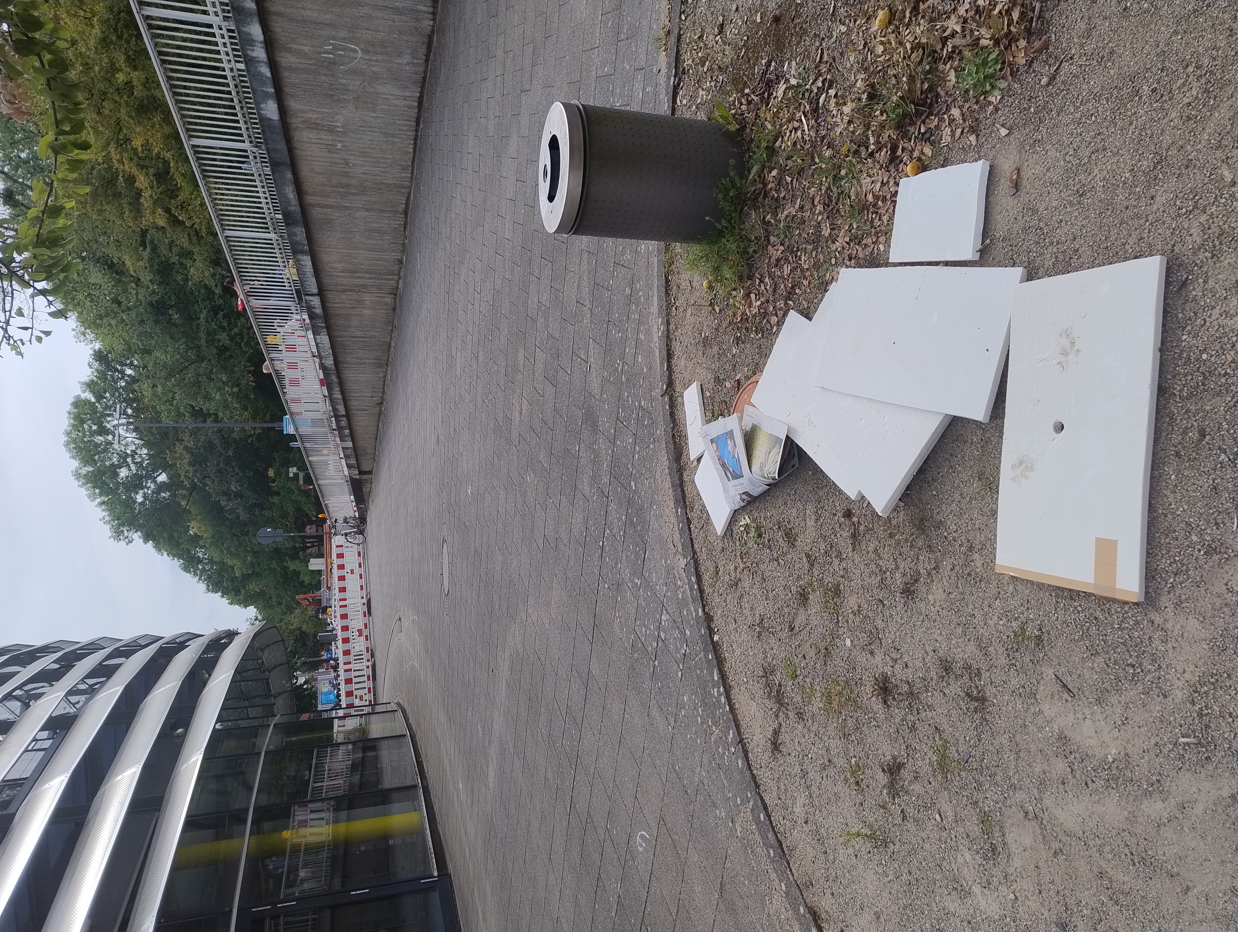 Beim Lentpark an einer Mülltonne liegt wilder Müll.
